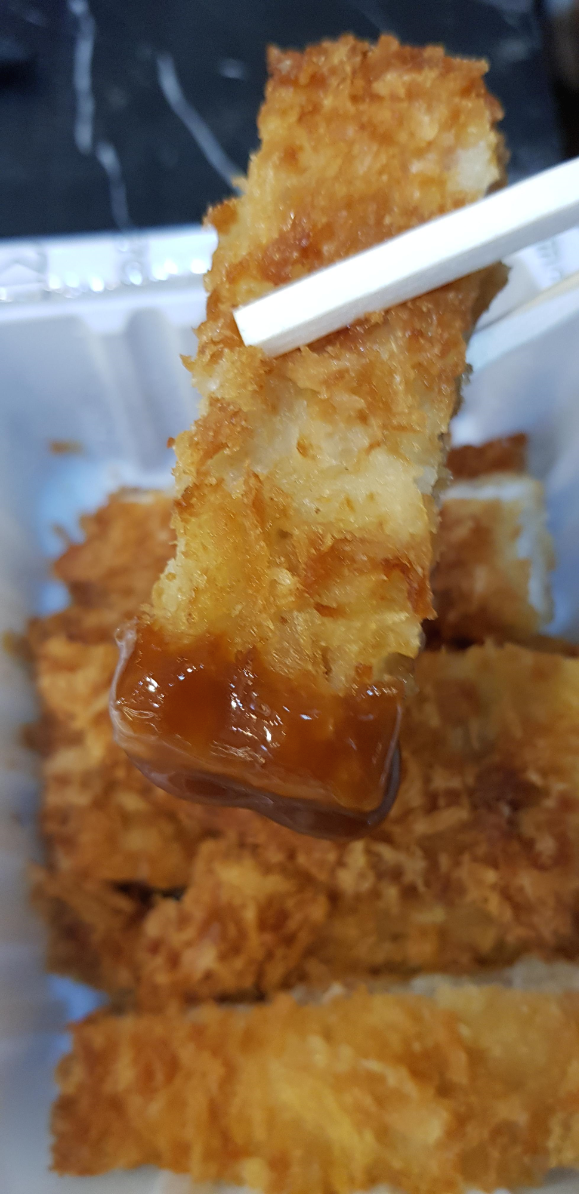 포장된 포장을 풀고 난 후 일단 돈가스 먼저 하나를 들어 소스를 찍어 한입 겉은 파삭파삭 속은 촉촉하면서