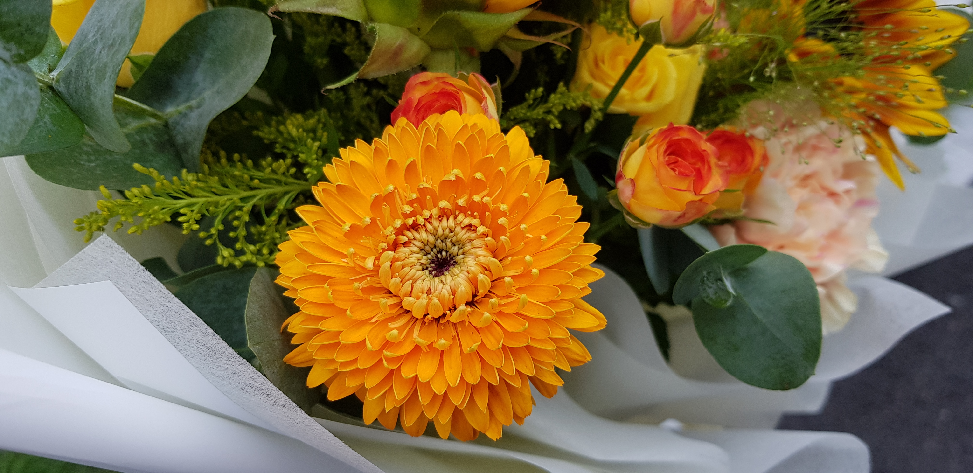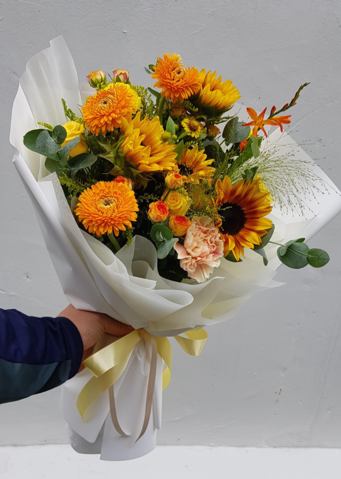 오늘따라 꽃다발 주황과 노랑의 조화가 이렇게 이쁘게 꽃다발이 보이는 색감이 기분이 다운되었을 때 딱 좋은 색감의
