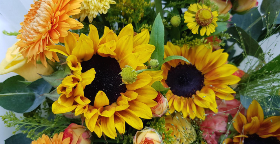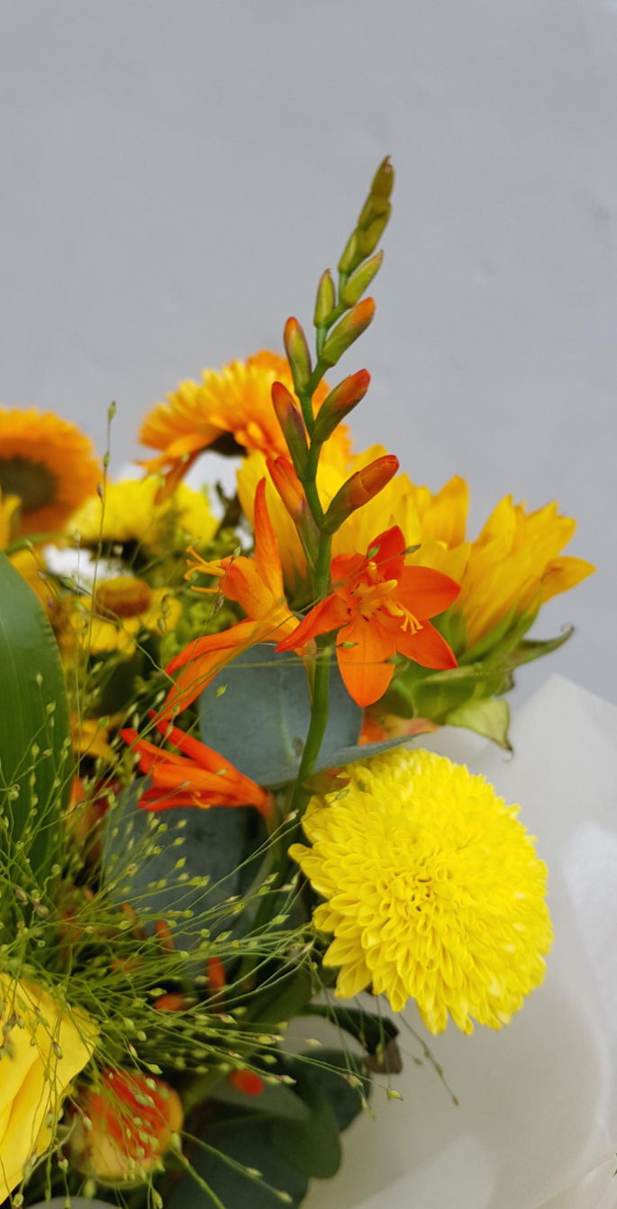 오늘따라 꽃다발 주황과 노랑의 조화가 이렇게 이쁘게 꽃다발이 보이는 색감이 기분이 다운되었을 때 딱 좋은 색감의