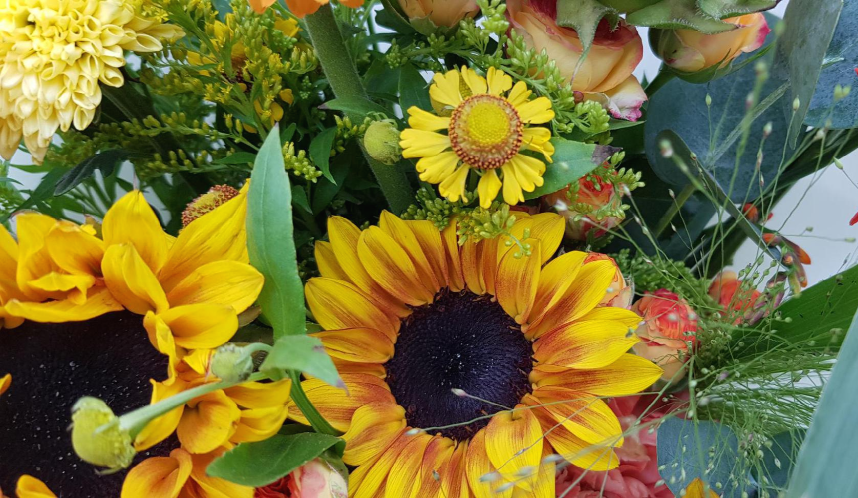 주황색 꽃들과 노란 꽃들이 조화롭게 노랗게만 알던 해바라기 잎이 엔틱스럽게 살짝 다크 한 느낌의 색이 들어간 것이