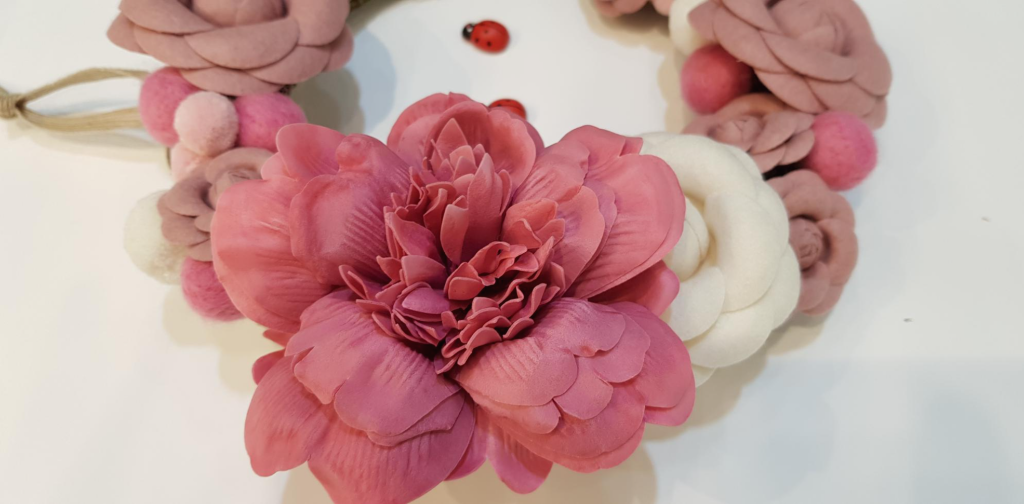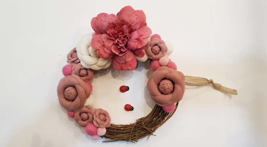 이 번 것은 비누꽃과 천으로 만든 꽃으로 리스를 만들어 봤습니다.