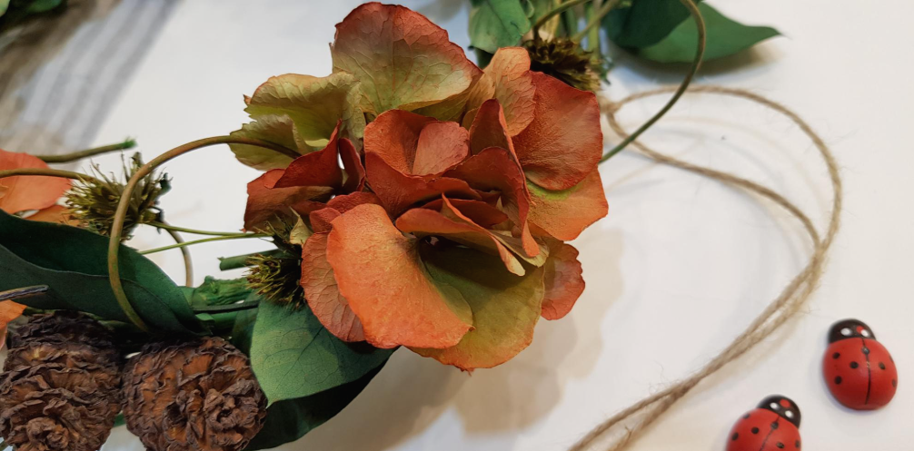 요번에는 초승달 리스로 만들어 봤습니다. 조화도 이용하고 프리져버드 수국도 이용하여서 리스를 만든 것입니다.