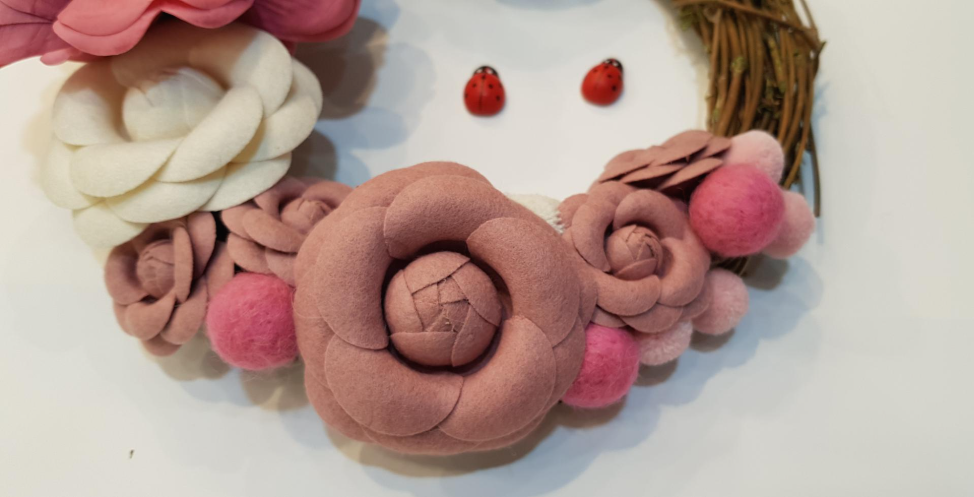 이 번 것은 비누꽃과 천으로 만든 꽃으로 리스를 만들어 봤습니다.