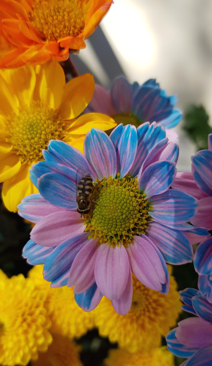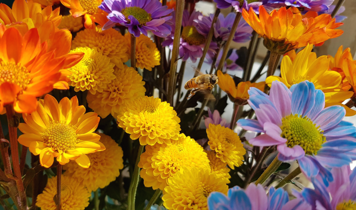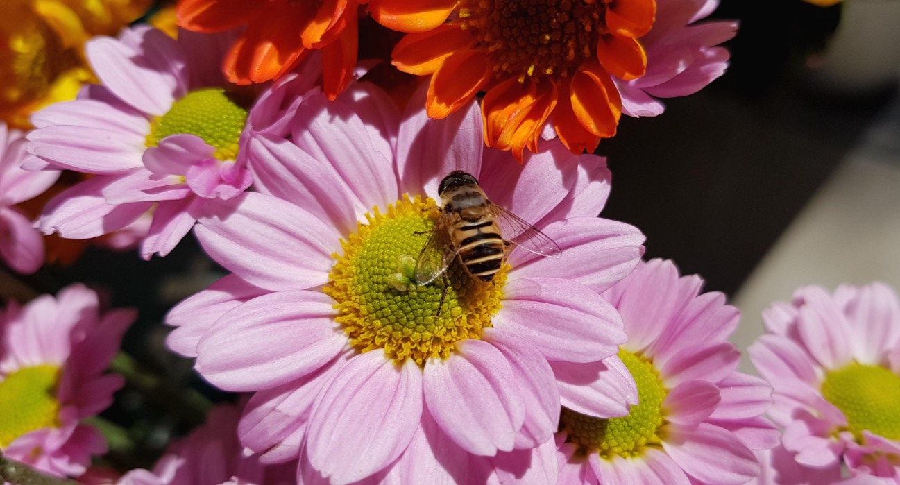 여러 종류의 소국 꽃들이 화려함을 뽐내고 있을 때 어디선가 짠 한 마리 벌이 있는가 싶더니
