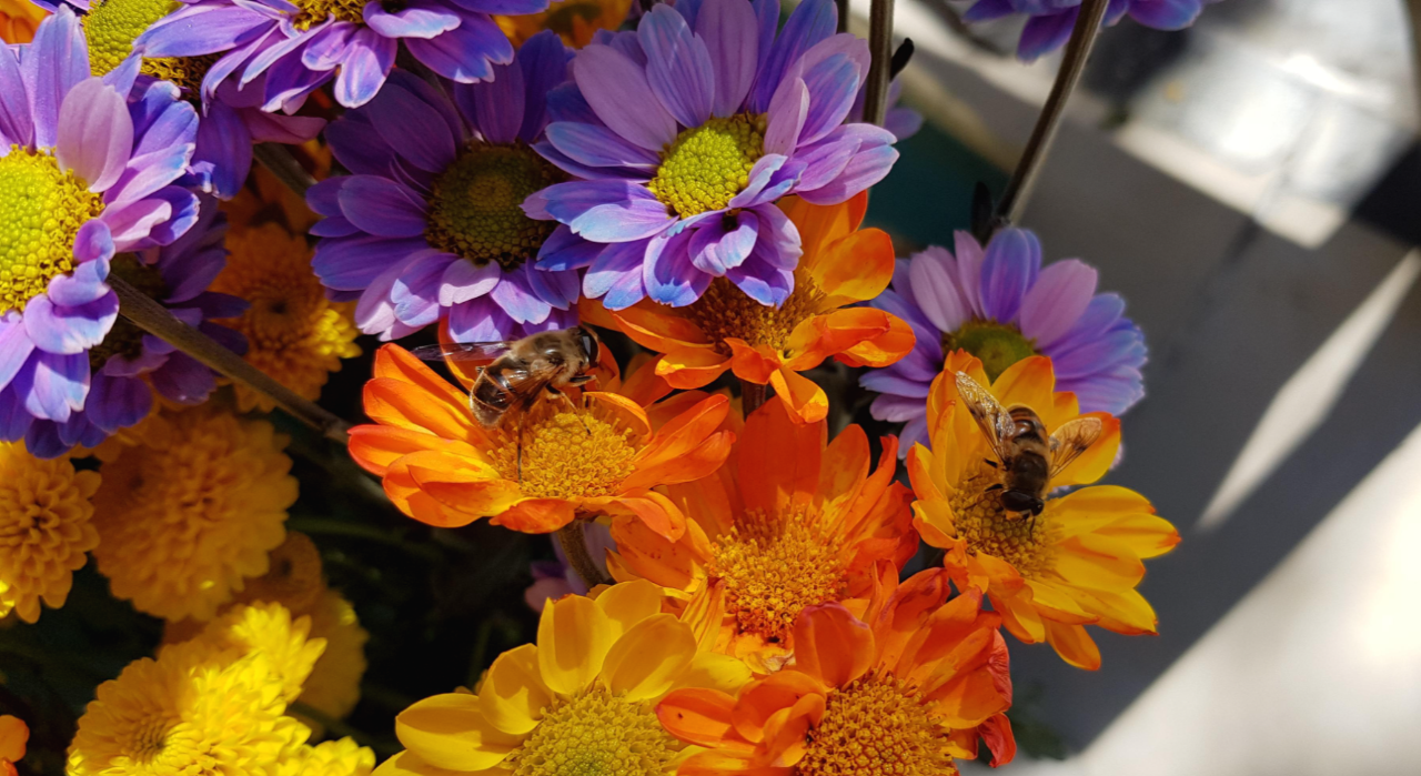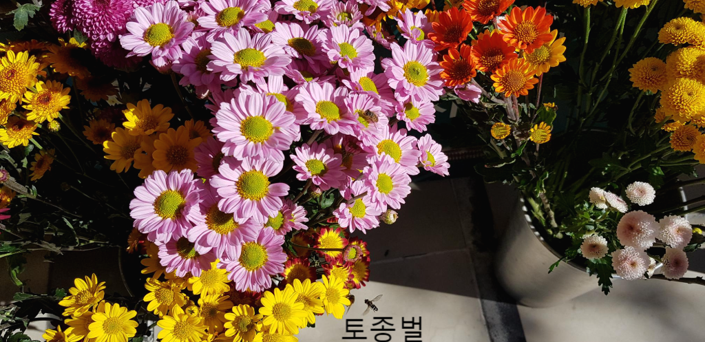 여러 종류의 소국 꽃들이 화려함을 뽐내고 있을 때 어디선가 짠 한 마리 벌이 있는가 싶더니