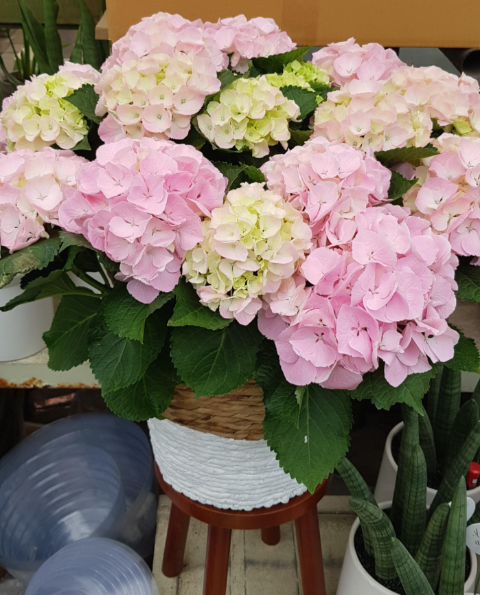 여기 수국 화분을 다른 꽃들 보가 꽃잎에 분무기로 물을 뿌려 주는 것도 꽃을 오래 볼 수 있는 방법 중 하나인 팁입니다.