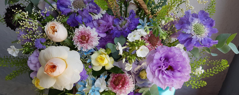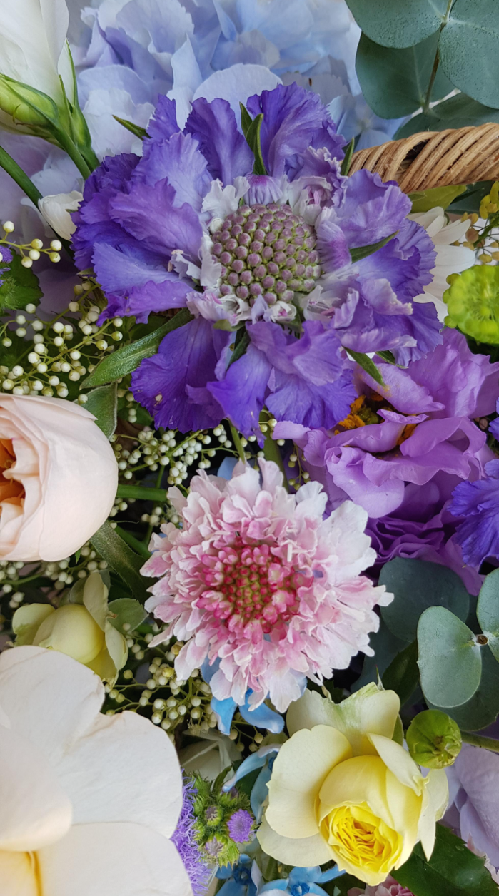 조금 더 진한 보랏빛 꽃은 스카비오사라는 꽃과 보랏빛의 강약의 조절이 돼서 꽃바구니 밸런스가 자연스러운