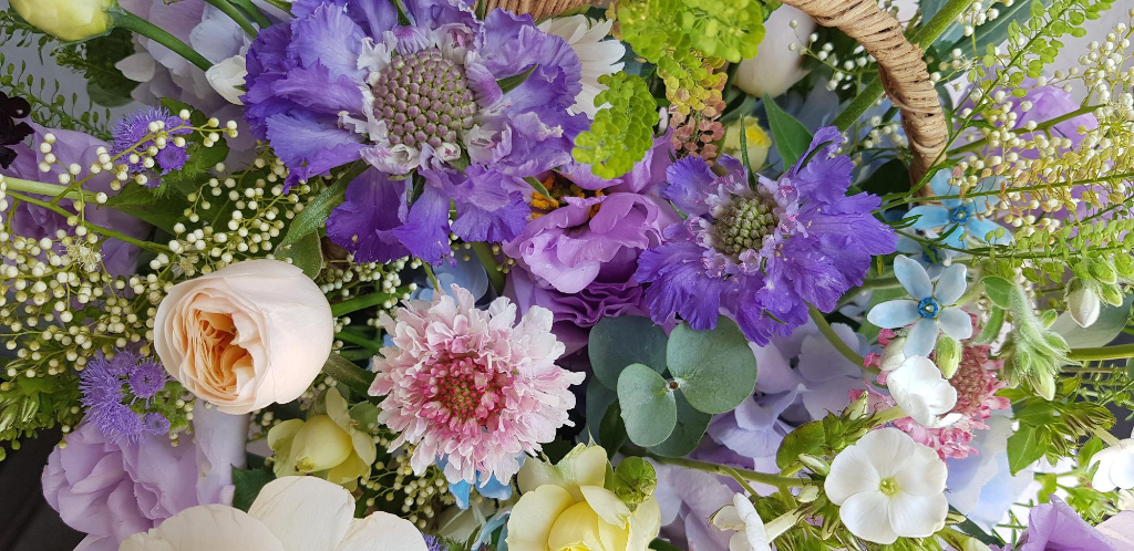 조금 더 진한 보랏빛 꽃은 스카비오사라는 꽃과 보랏빛의 강약의 조절이 돼서 꽃바구니 밸런스가 자연스러운