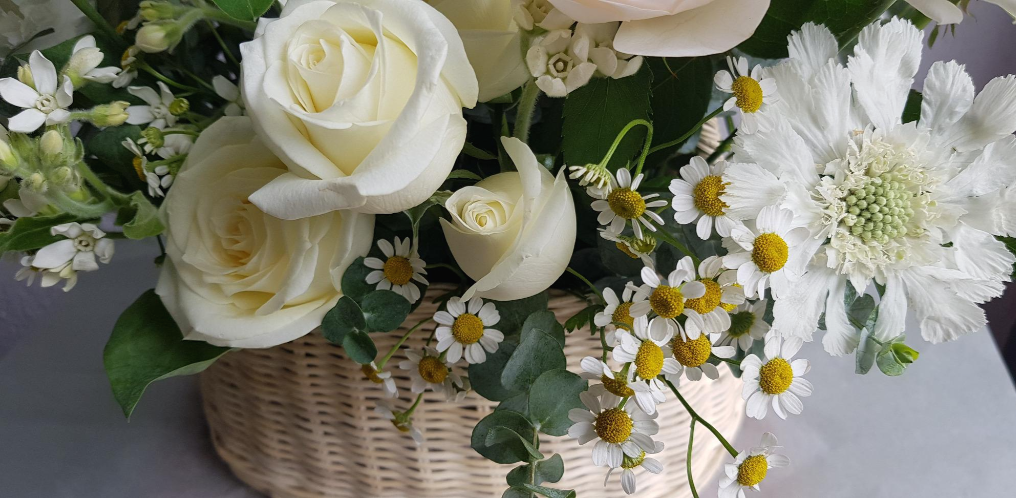 순백색의 리시안셔스의 청순하면서도 단아함을 마트 리카리 아가 옆에서 지켜주는 것 같은 게 자연스럽게