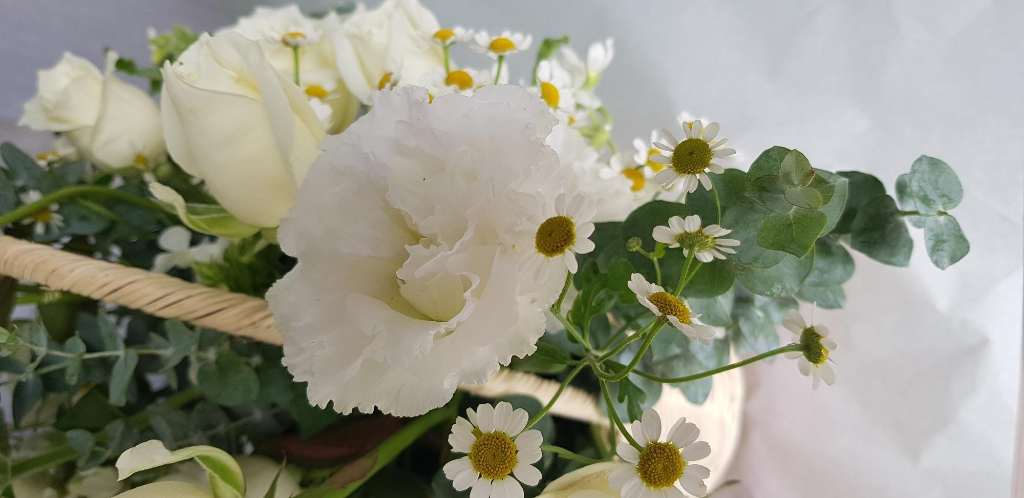 순백색의 리시안셔스의 청순하면서도 단아함을 마트 리카리 아가 옆에서 지켜주는 것 같은 게 자연스럽게