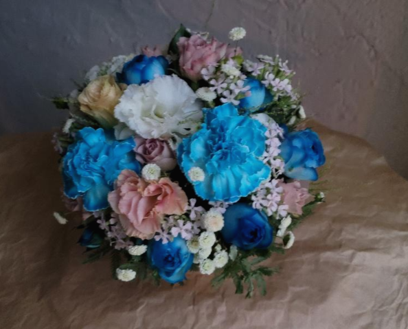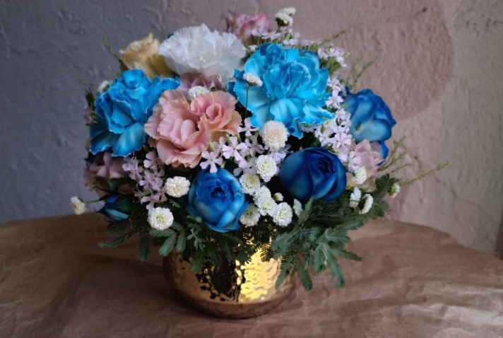 파란색으로 염색한 장미와 파란 카네이션이 조화롭게 잘 어울리는 것 같지요.