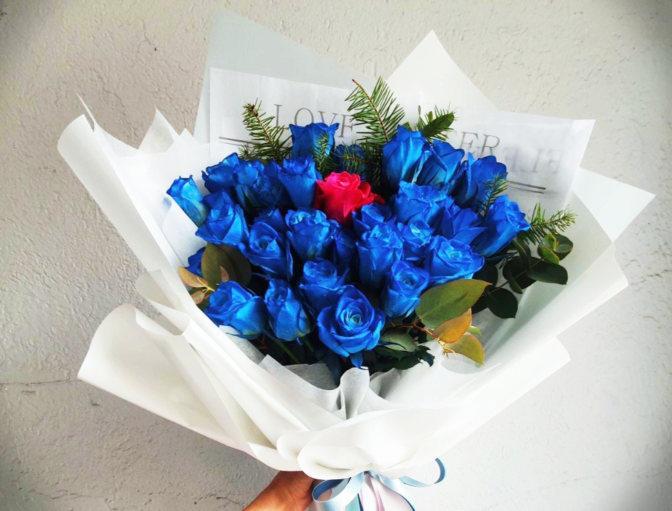 파란장미와 전혀 안 어울릴 것 같았는데 가운데 레드장미 한 송이도 나쁘지는 않아 보이네요.