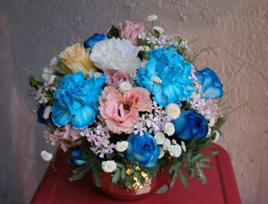 파란색으로 염색한 장미와 파란 카네이션이 조화롭게 잘 어울리는 것 같지요.