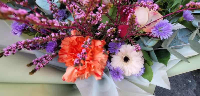 약간 색감의 밸런스를 맞추기 위해 연간 거베라를 넣어 보니 한결 꽃다발 색감이 한눈에 꽃들이 들어오는 게 이뻐 보이네요