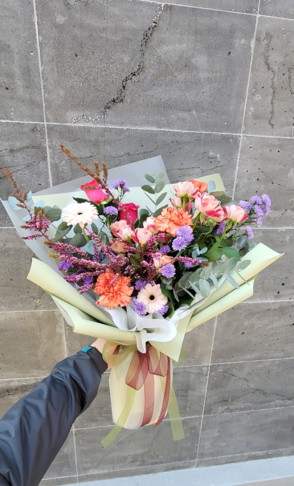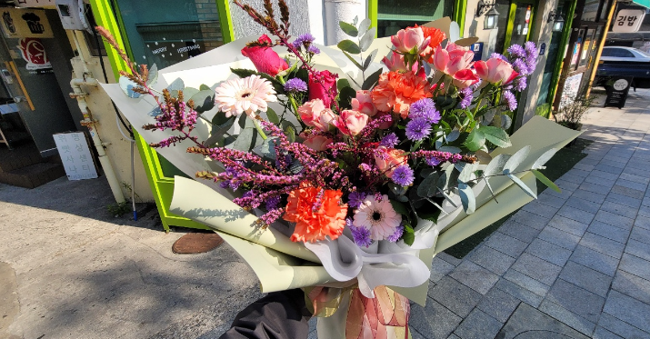저희 어머니도 은은한 파스텔톤 꽃다발보다는 화려한고 진한 색감의 꽃을 좋아하셔서 진한 색감만 하면 너무 진해 보여서