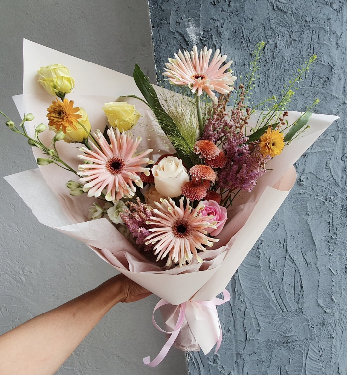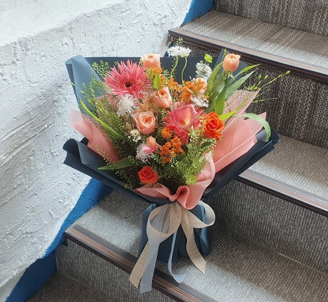 동료들과 함께 성공 축하 파티를 기념하며 축하 꽃다발
