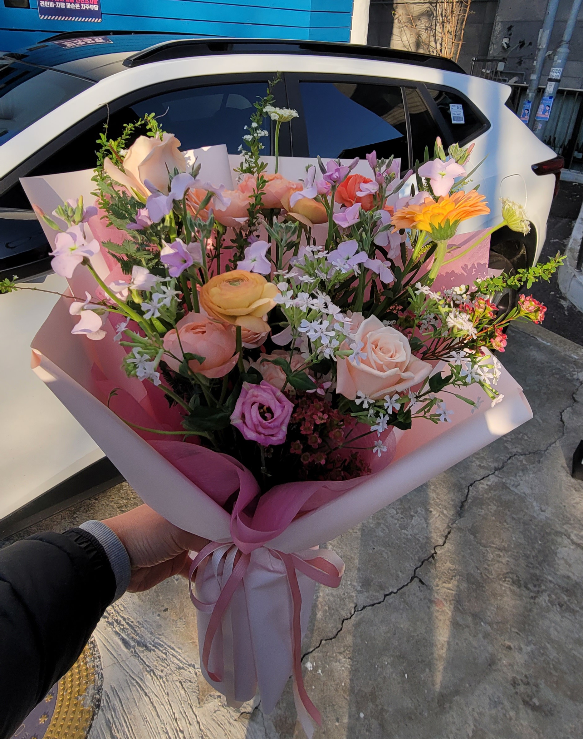 준비된 꽃다발은 교회와 가족의 축하를 전달하는 매개체였습니다.