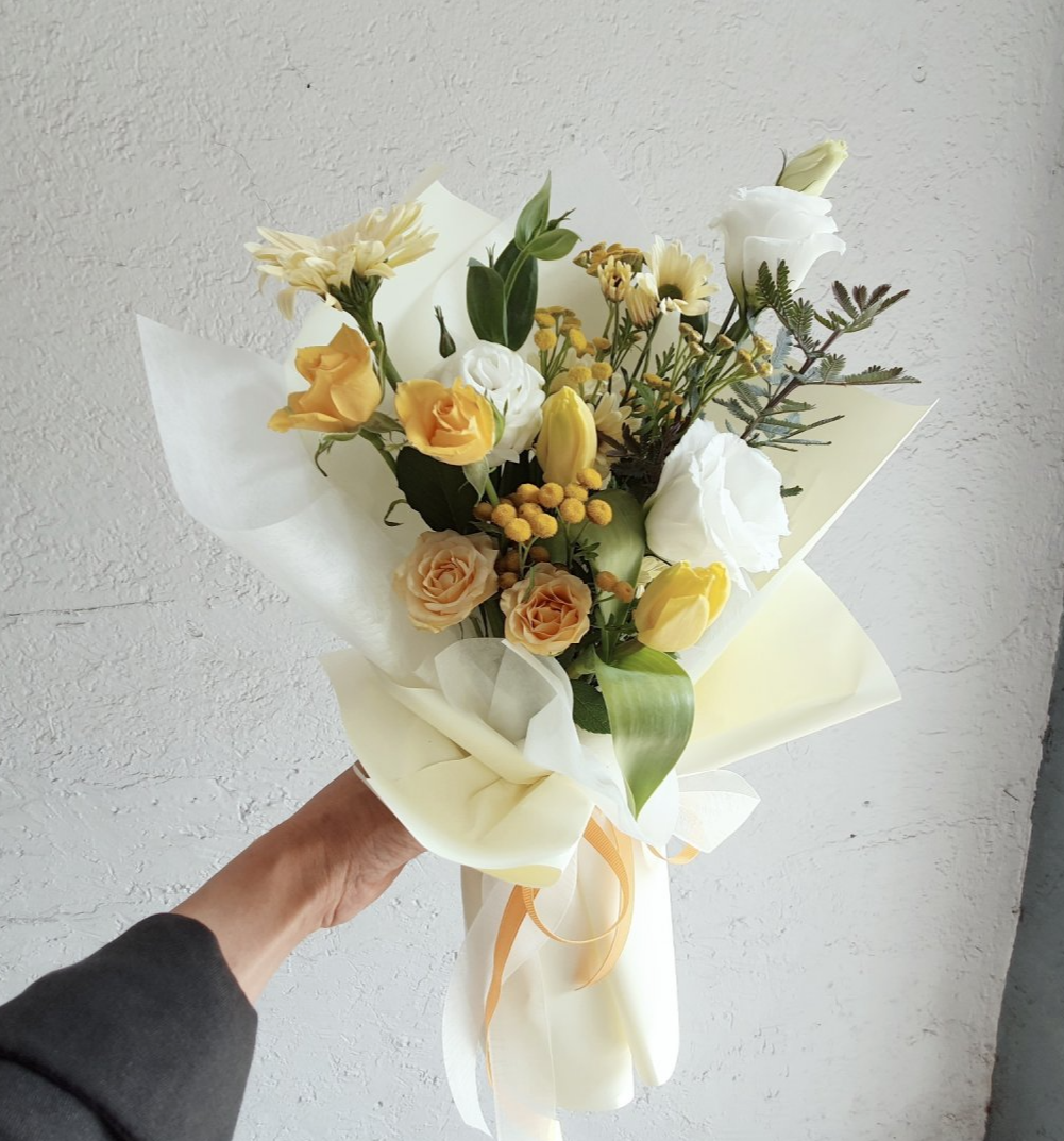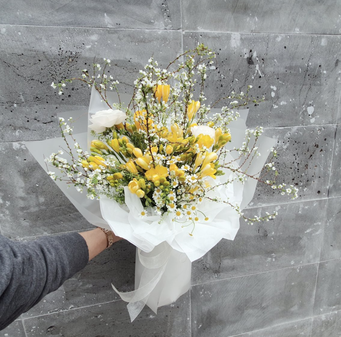 스마트 캐주얼 스타일에는 컬러풀한 혼합 꽃다발보다는 단일 톤의 튤립이나 작약을 선택해 깔끔한 이미지를 줄 수 있습니다.