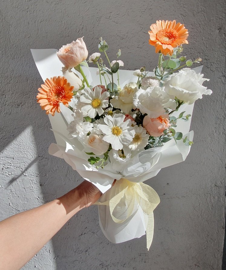 졸업식 사진 촬영을 고려한다면 꽃다발의 포장지도 의상의 색상과 잘 어울리게 맞추는 것이 중요합니다.