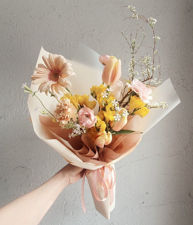 사진 촬영 시 꽃다발이 어색하지 않도록 자연스러운 디자인을 추천합니다.