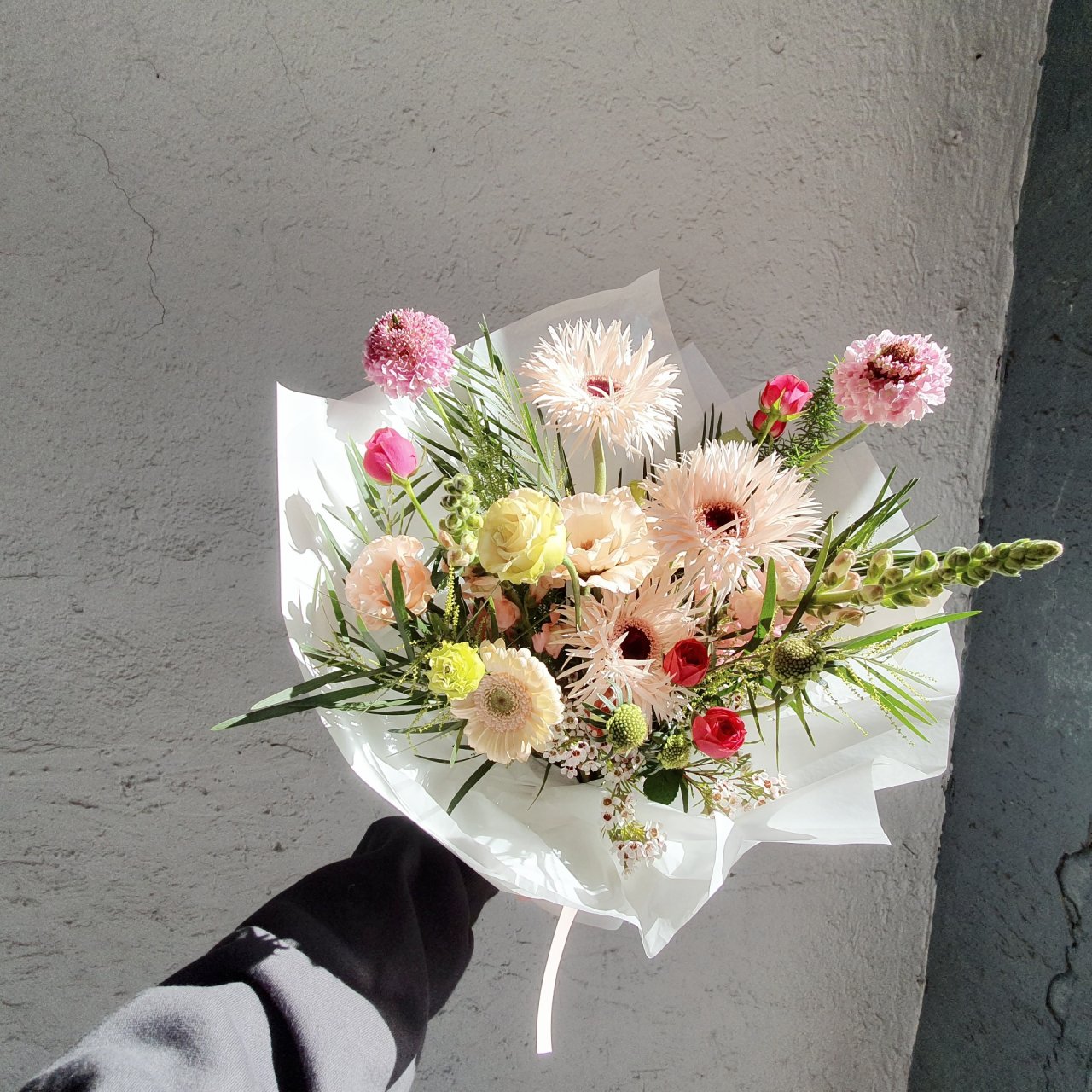 꽃의 색상이 선명하고 포장의 디자인이 깔끔한 꽃다발이 사진에 잘 어울립니다.