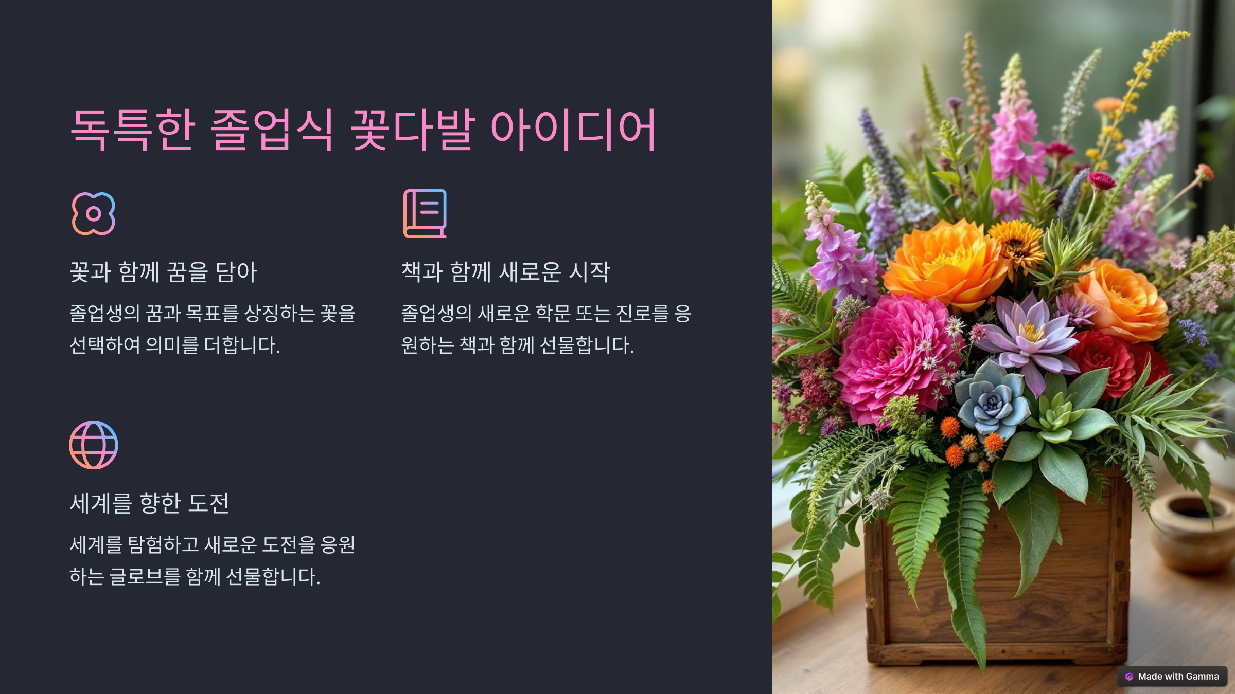 졸업식 꽃다발은 받는 사람뿐만 아니라 준비하는 사람에게도 행복한 기억을 만들어줘요. 졸업생을 위한 작은 정성과 세심한 마음이 꽃다발에 담길 때, 그날의 감동은 더욱 오래 기억될 거예요.