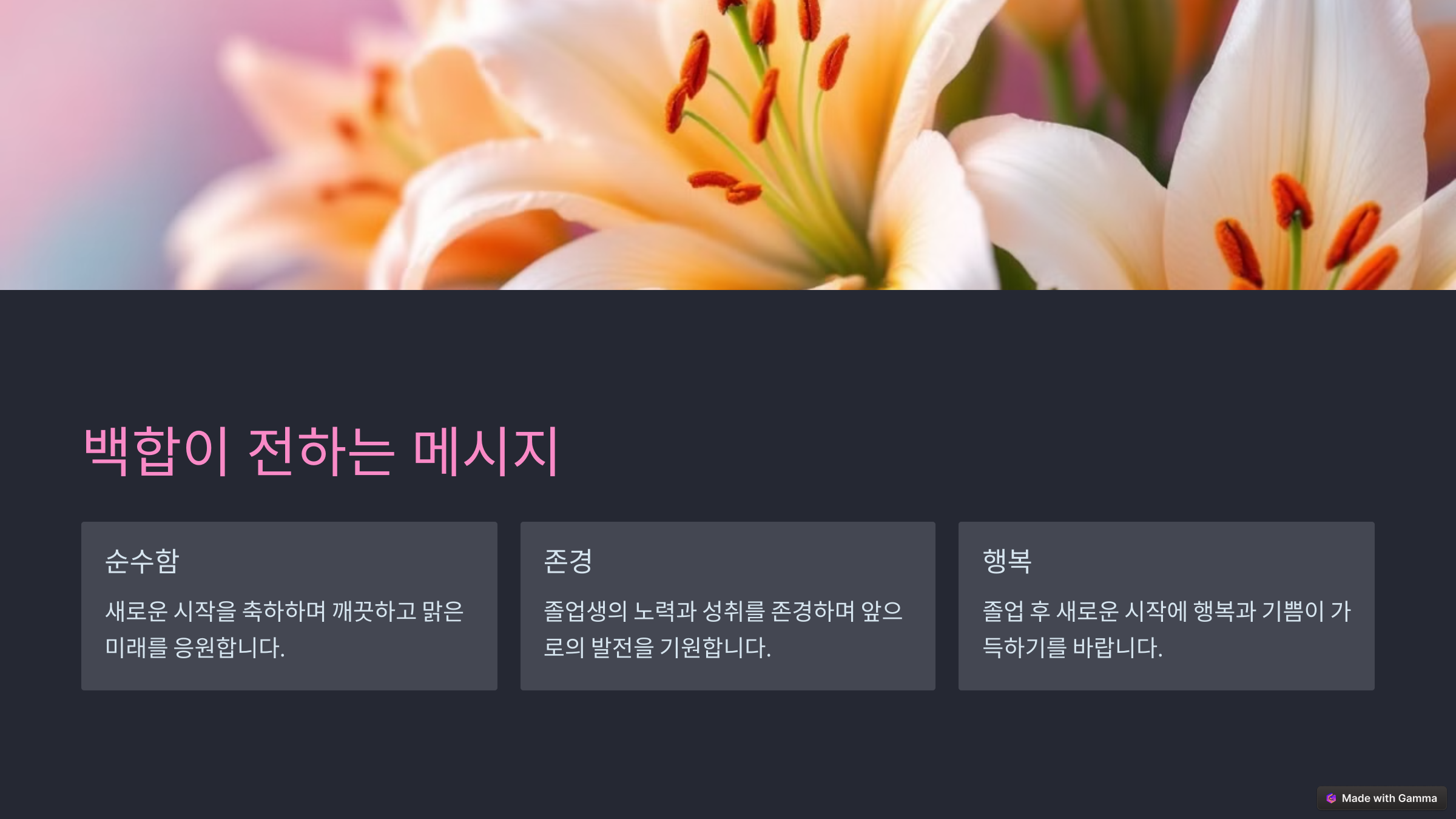 백합은 졸업식에서 우아함과 고결함을 상징하는 꽃이에요. 백합은 그 자체로도 충분히 아름답지만, 특별한 꽃말 덕분에 더욱 의미 있는 졸업식 선물이 되죠. 흰 백합은 순수함과 새로운 출발을, 노란 백합은 감사와 따뜻함을 상징해요. 졸업생의 성취를 축하하고, 미래를 응원하는 메시지를 담기에는 백합만큼 좋은 꽃이 드물어요.
