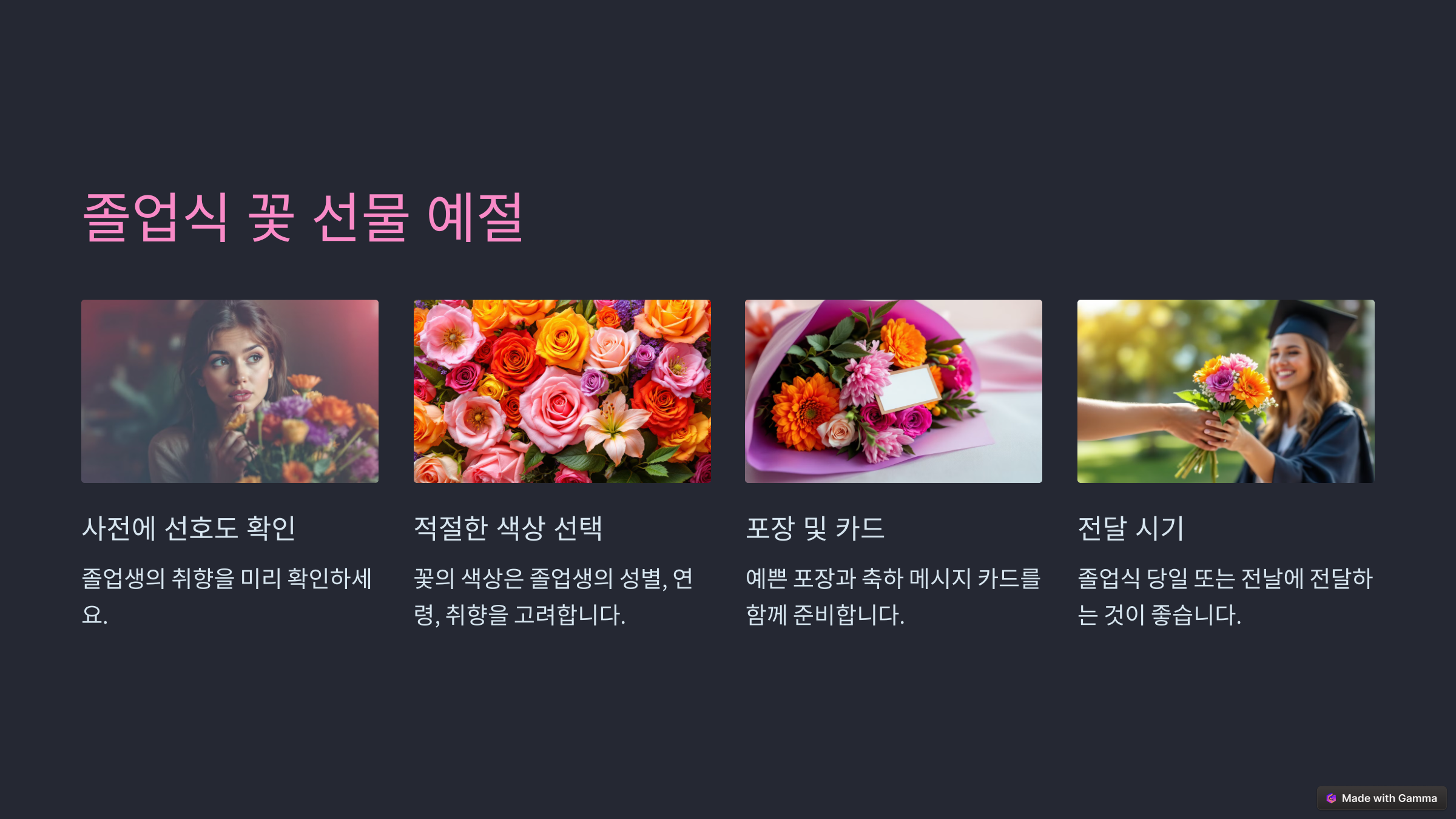 졸업식 꽃다발은 받는 사람뿐만 아니라 준비하는 사람에게도 행복한 기억을 만들어줘요. 졸업생을 위한 작은 정성과 세심한 마음이 꽃다발에 담길 때, 그날의 감동은 더욱 오래 기억될 거예요.