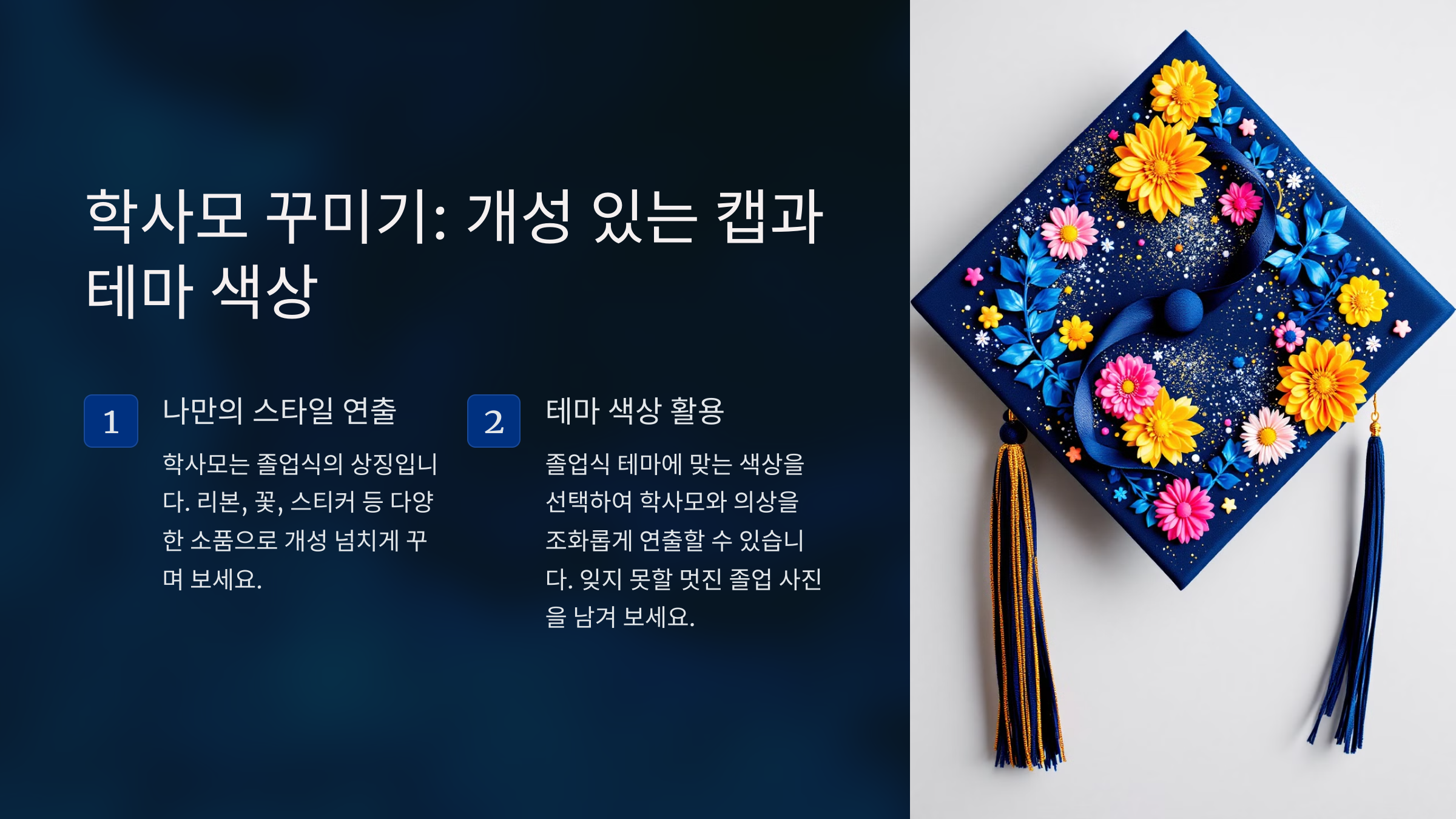 1. 맞춤 학사모: 학사모 위에 졸업생의 이름, 졸업 연도, 또는 좋아하는 문구를 넣어 개성을 드러내세요. 스티커나 패치를 활용해 간단히 꾸밀 수 있어요.