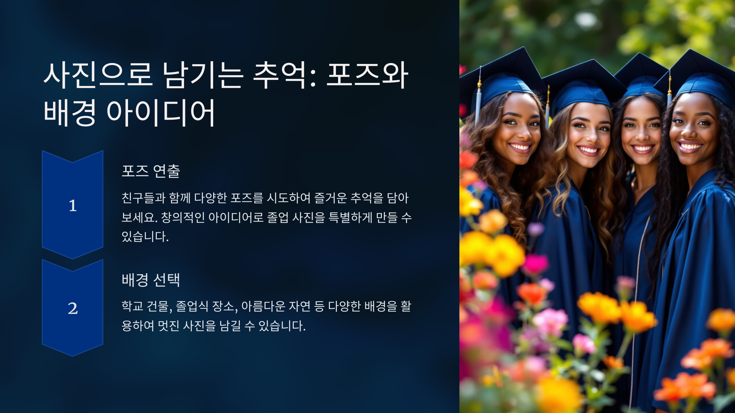졸업식의 특별한 순간을 사진으로 남길 때, 기존의 포즈와 구도에서 벗어나 독창적인 연출을 시도해보세요. 사진 속에서 졸업생의 개성과 특별함이 돋보일 거예요.