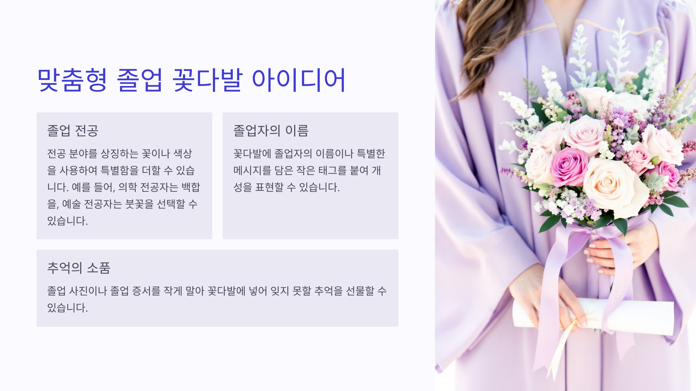 졸업식 꽃다발을 더욱 특별하게 만들고 싶다면, 맞춤형 아이디어를 활용해보세요. 졸업생의 개성을 반영하거나 독특한 테마를 적용하면 기억에 남는 꽃다발이 된답니다.