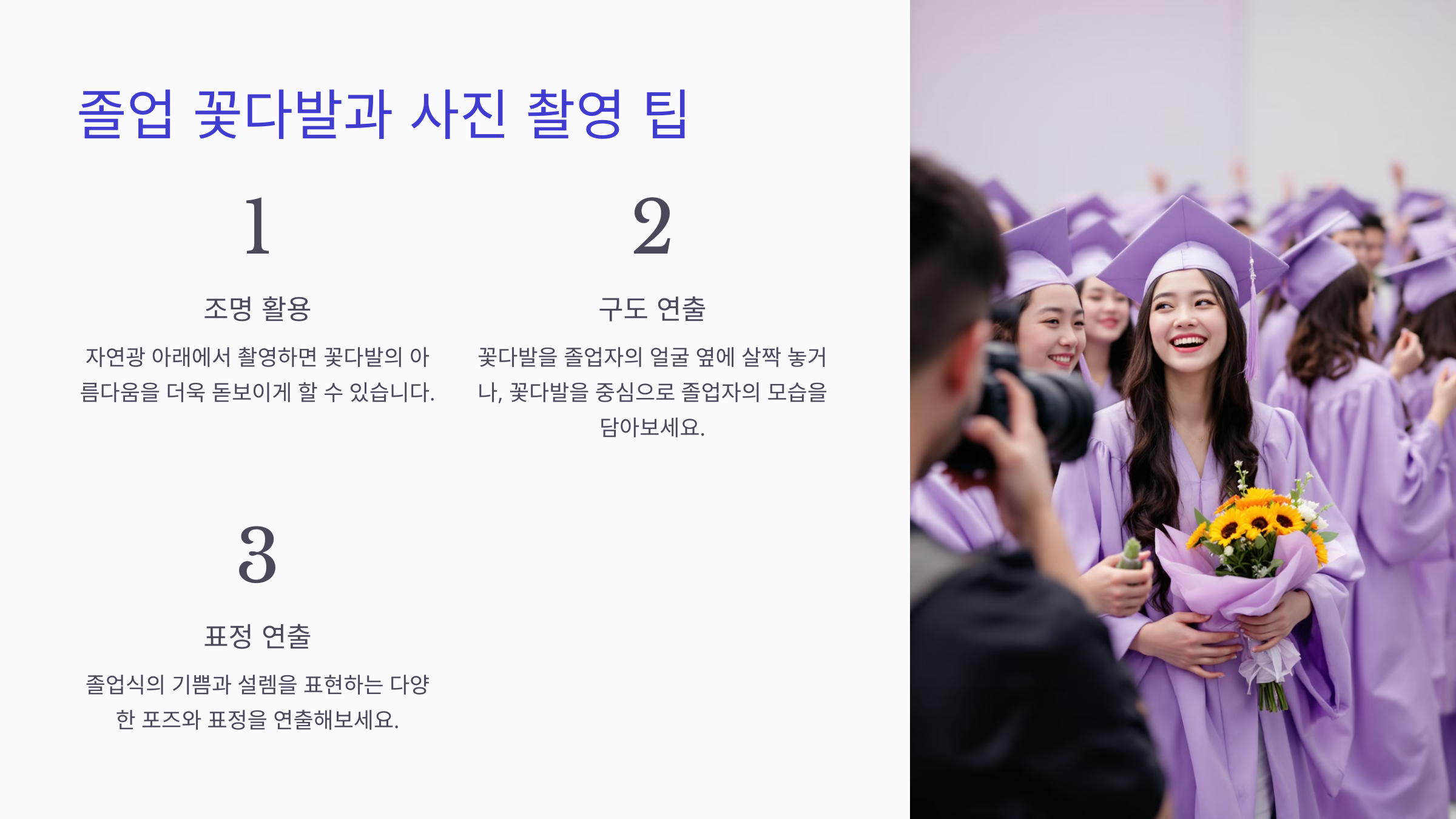 졸업식에서 꽃다발과 함께하는 사진은 오랜 시간 추억으로 남게 돼요. 특별한 사진을 남기고 싶다면 몇 가지 팁을 참고해 보세요.