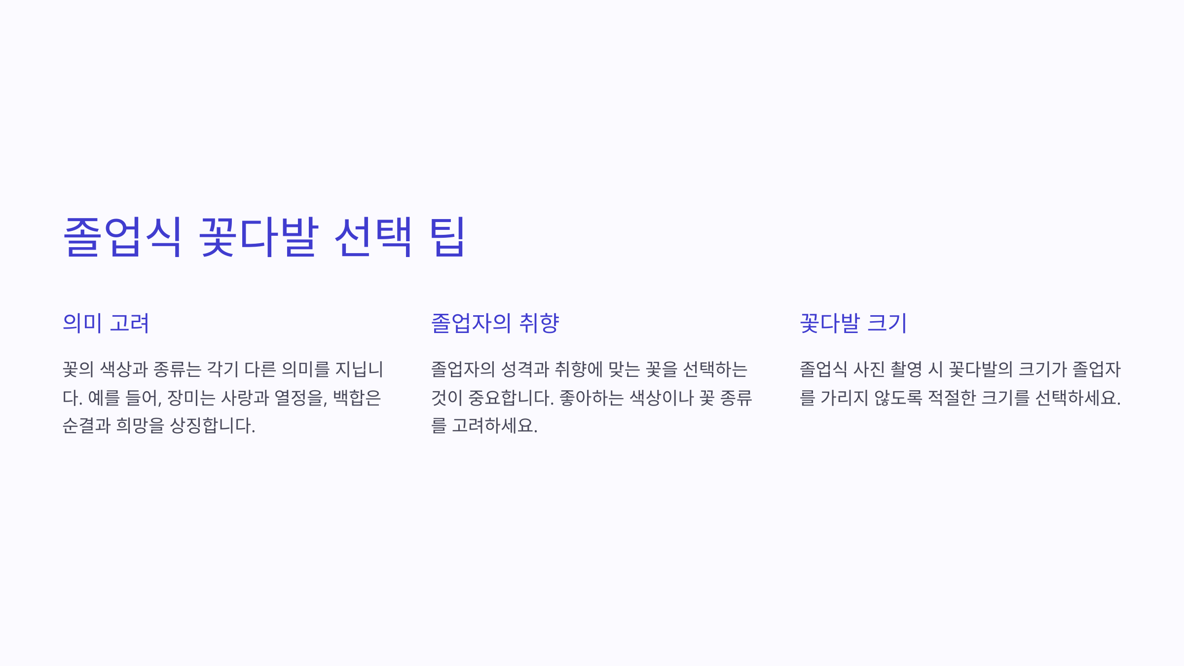 첫 번째로 고려해야 할 점은 색상이랍니다. 예를 들어, 빨간색은 열정과 사랑을, 노란색은 우정을, 하얀색은 순수와 새로운 시작을 상징해요. 졸업생의 성격에 어울리는 색상의 꽃을 골라보세요. 색상 조화가 잘 어우러질수록 꽃다발의 완성도가 높아져요.