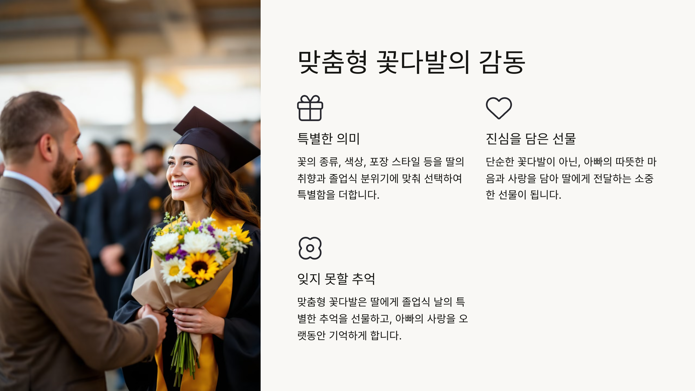 또한, 꽃다발에 작은 디테일을 추가하면 더 특별한 선물이 될 거예요. 예를 들어, 아빠의 이름이 새겨진 리본이나, 졸업식 날짜를 적은 태그를 포함하면 오랫동안 간직하고 싶은 선물이 될 수 있어요.