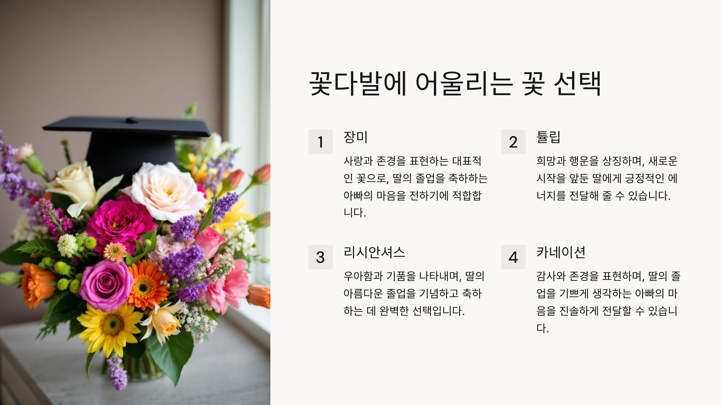 졸업식은 자녀의 새로운 출발을 축하하는 날이자, 부모님에게 감사의 마음을 전하는 특별한 순간이에요. 특히, 아빠의 깊은 사랑과 헌신을 담은 꽃다발은 단순한 선물을 넘어 진심과 감동을 전할 수 있는 방법이에요.