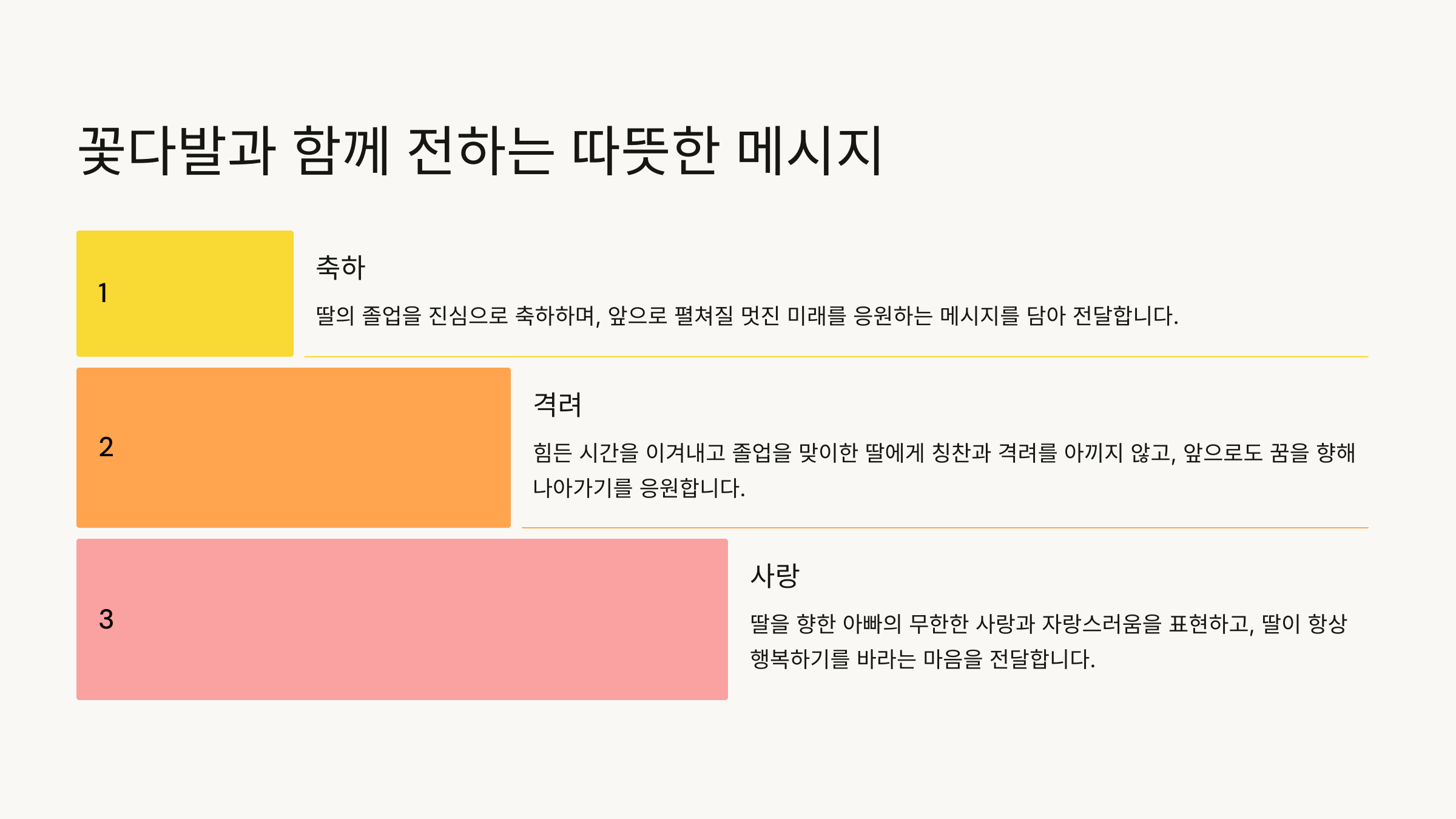 감사는 자녀의 성장을 묵묵히 도와준 아빠에게 전하는 마음이에요. 꽃다발을 통해 "아빠 덕분에 오늘 제가 이 자리에 설 수 있었어요"라는 진심 어린 메시지를 전달할 수 있답니다.