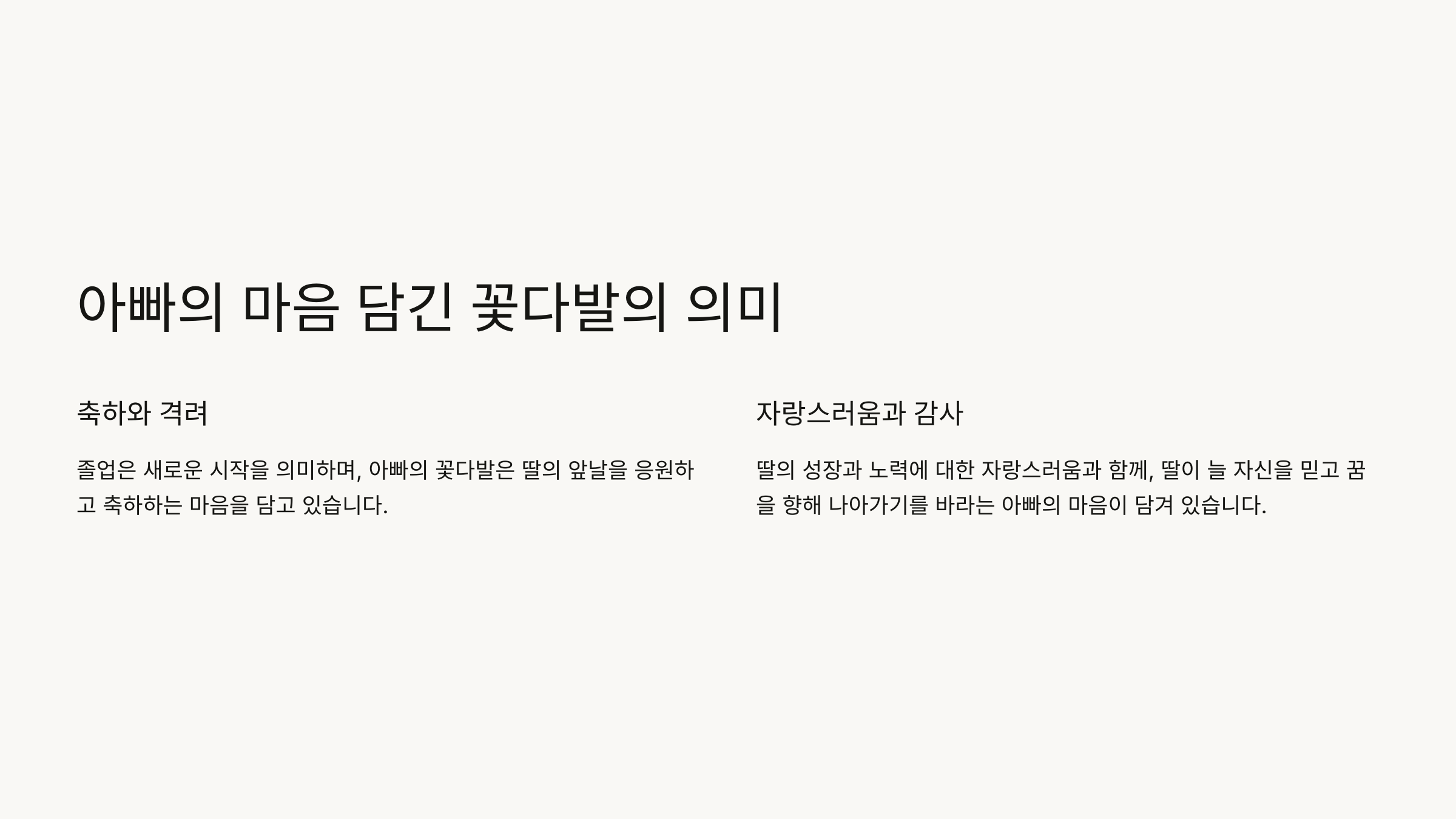 감사는 자녀의 성장을 묵묵히 도와준 아빠에게 전하는 마음이에요. 꽃다발을 통해 "아빠 덕분에 오늘 제가 이 자리에 설 수 있었어요"라는 진심 어린 메시지를 전달할 수 있답니다.