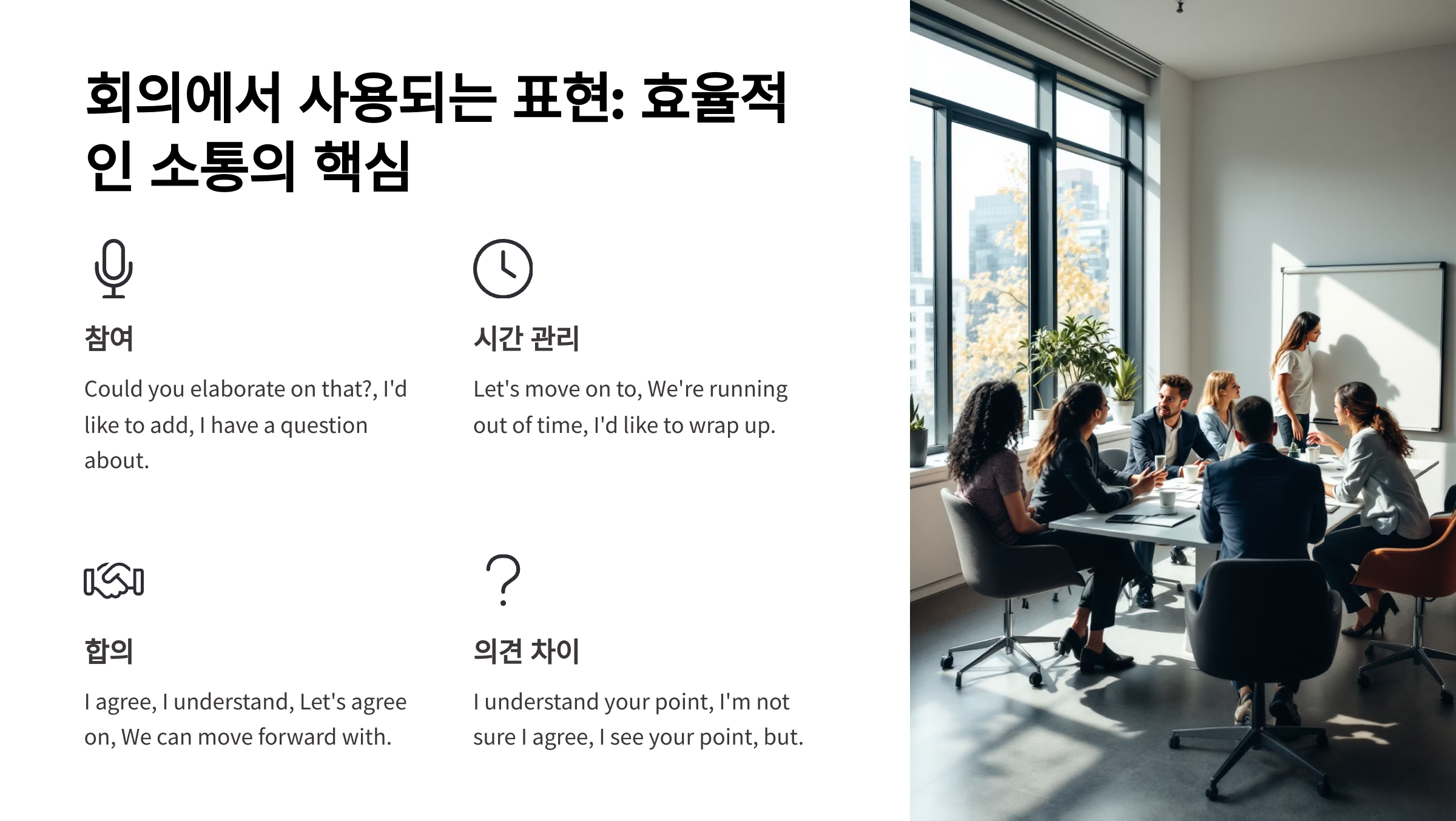 회의에서는 의사소통이 가장 중요한 만큼, 적절한 표현과 몸짓 언어가 큰 영향을 미쳐요. 명확하게 자신의 의견을 전달하면서도 상대방을 존중하는 표현을 사용하는 것이 중요해요.