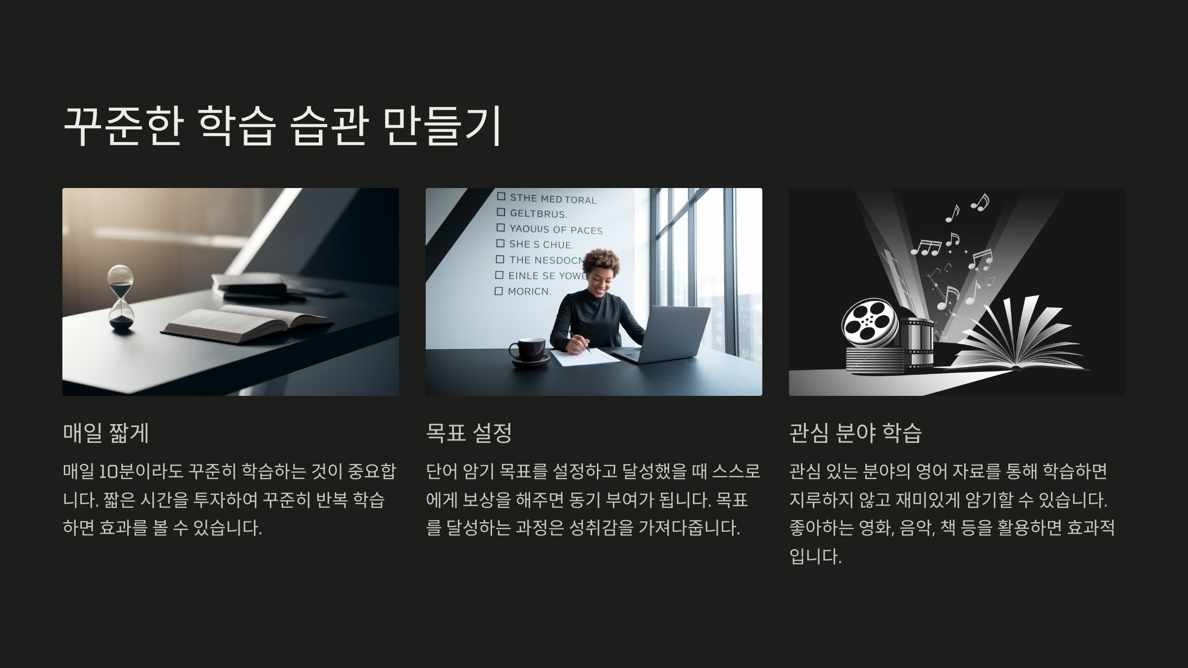 영어 실력을 향상시키기 위해서는 꾸준히 학습할 수 있는 습관을 만드는 것이 중요해요. 하루 10~15분만이라도 영어를 학습하는 시간을 정해보세요. 이 시간이 짧아 보이지만, 매일 꾸준히 하면 큰 변화를 가져올 수 있어요.