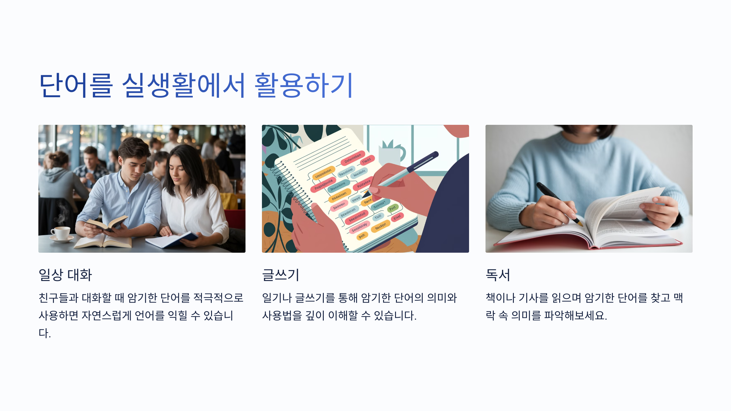 제가 생각했을 때, 단어 암기는 단순한 기억 활동이 아니라, 이해와 활용의 과정이에요. 그래서 단어를 외우는 동안 그 의미와 쓰임새를 함께 익히는 것이 좋아요.