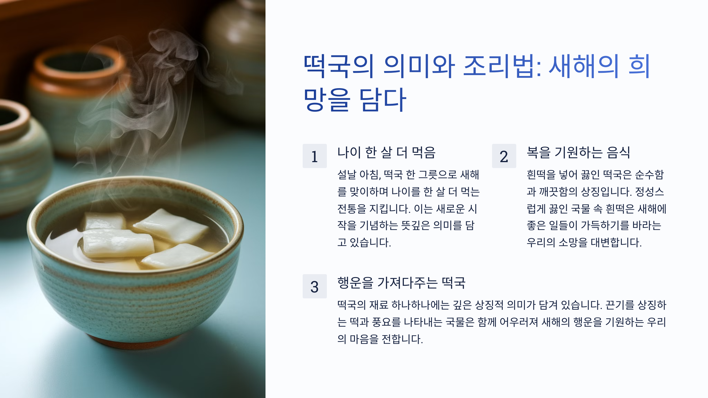 떡국은 단순한 음식 그 이상으로, 새해의 시작을 축하하며 가족 간의 화합을 다지는 특별한 상징을 담고 있어요. 설날마다 이 음식을 준비하며 전통의 소중함을 느낄 수 있답니다.