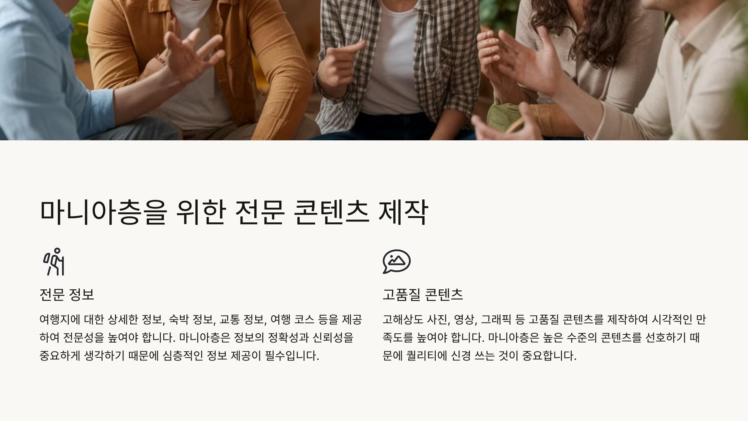 틈새 시장을 겨냥하려면 구체적이고 명확한 타겟층을 설정하는 것이 중요해요. 먼저, 관심사, 연령대, 라이프스타일에 따라 세분화된 그룹을 설정하세요. 예를 들어, 자연 애호가, 역사 여행 팬, 또는 현지 음식에 관심이 많은 사람들을 대상으로 할 수 있어요.