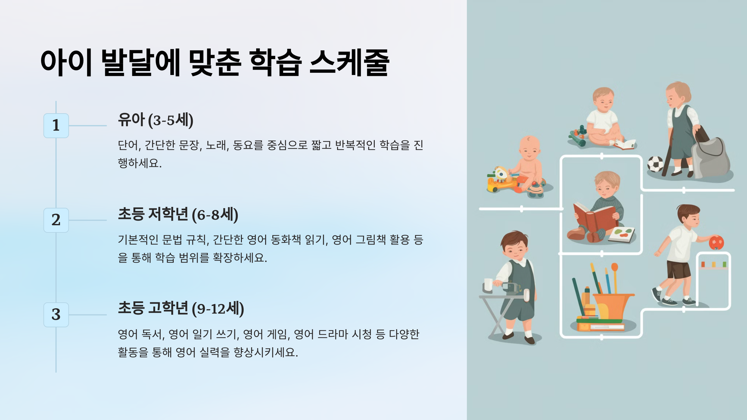 아이의 발달 단계에 맞춰 학습 스케줄을 짜는 것도 중요해요. 유아기에는 하루 10~15분씩 짧게 영어를 노출시키는 것으로 충분해요. 영어 동요를 듣거나, 간단한 단어를 함께 따라 읽는 시간을 마련해보세요.