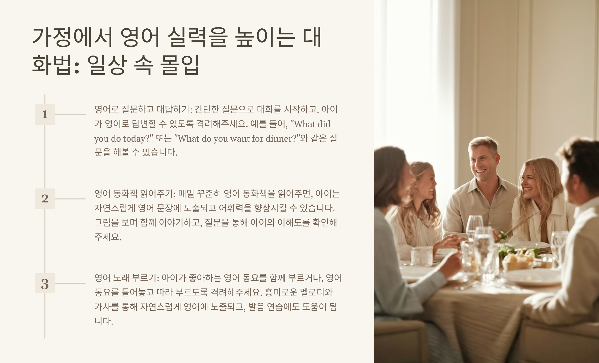 아이의 영어 실력을 높이기 위해 가장 효과적인 방법 중 하나는 가정에서 자연스럽게 영어로 대화하는 것이에요. 하지만 부모가 영어에 자신이 없거나 아이가 영어를 거부할 경우 어떻게 해야 할까요?