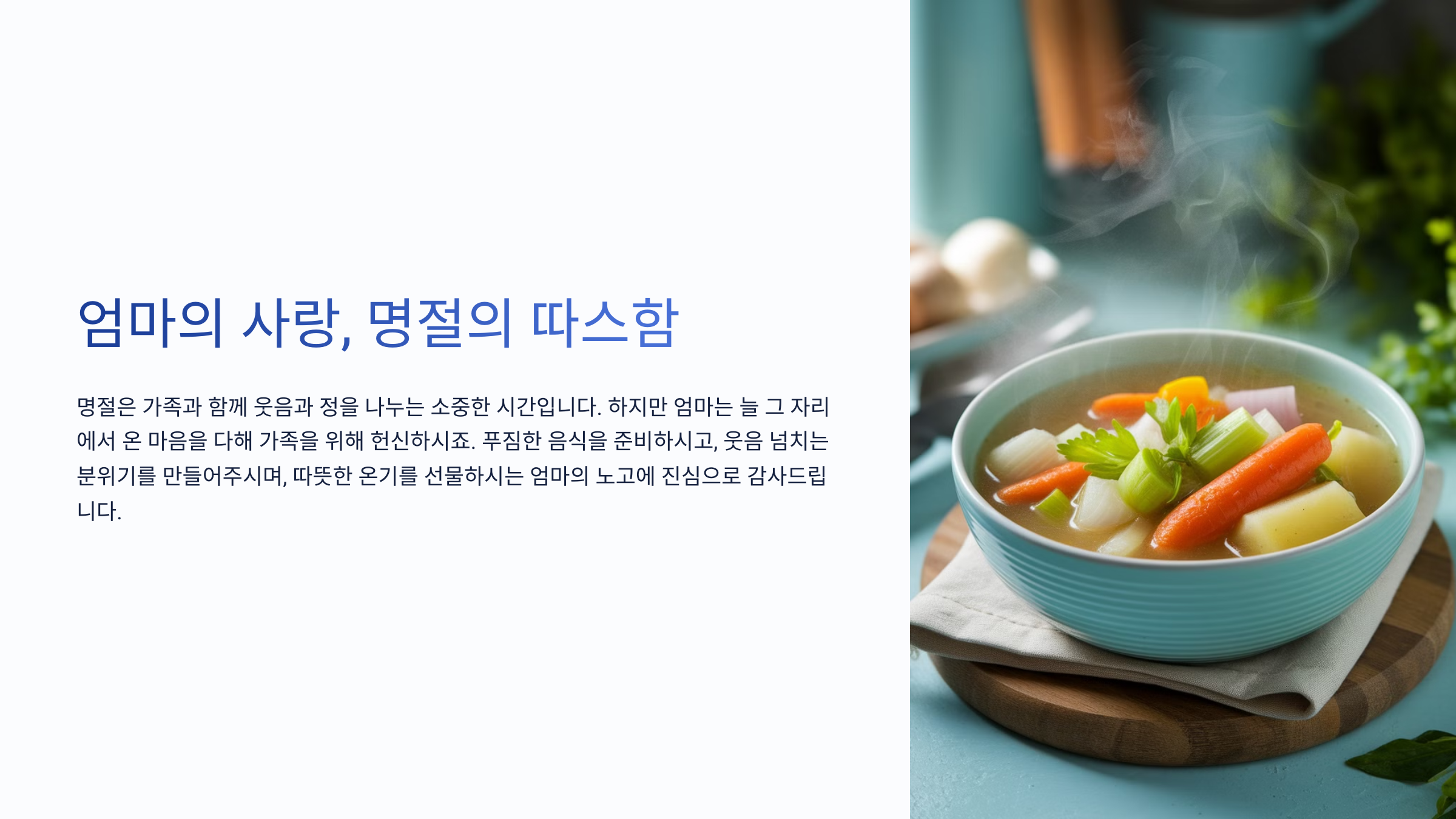말 한마디, 작은 행동 하나로도 엄마는 큰 감동을 받을 거예요. 이번 명절엔 엄마에게 따뜻한 마음을 전해보세요.