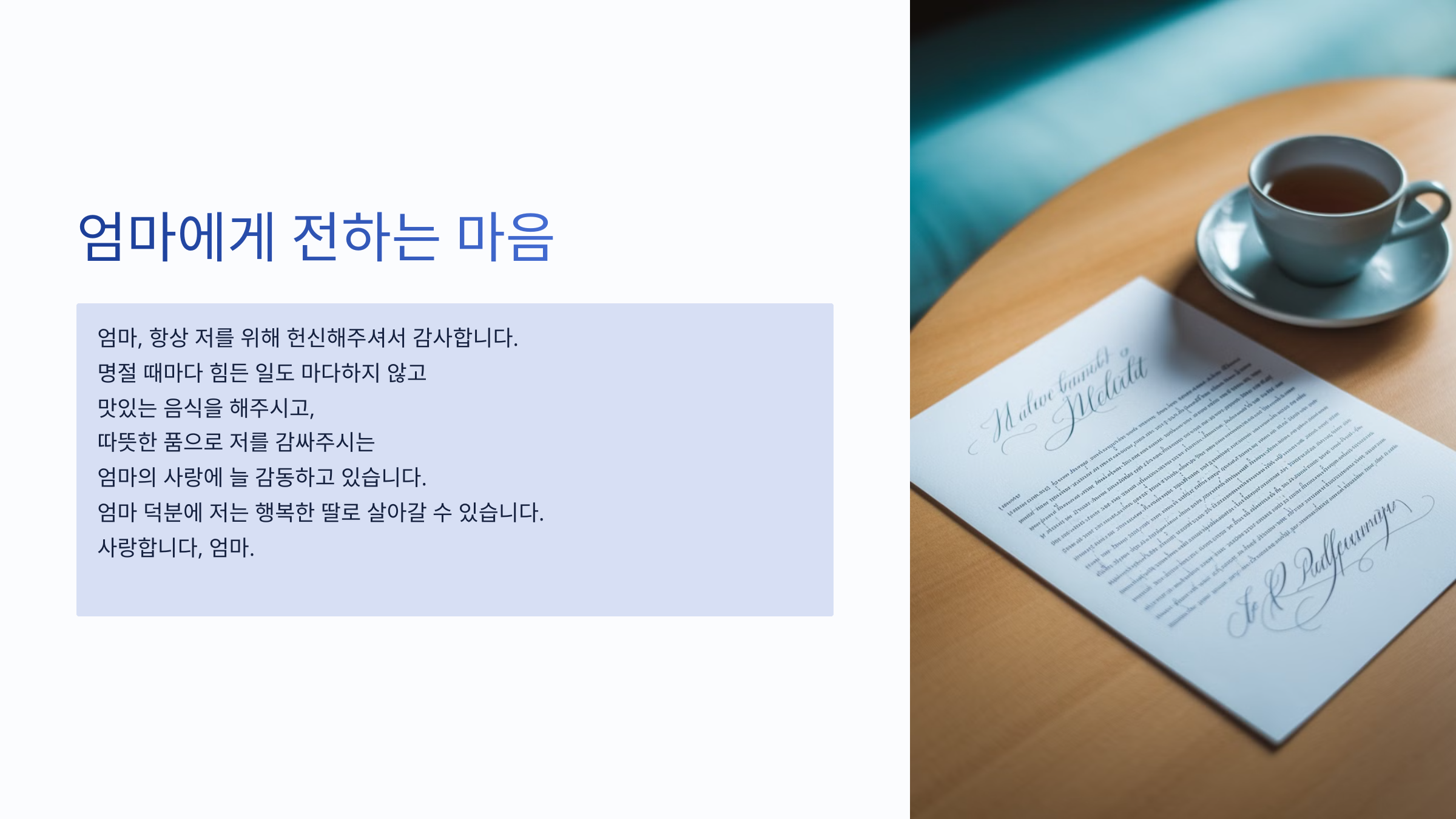 가끔은 말로 전하기 어려운 마음을 편지로 적어보는 것도 좋아요. 손글씨로 한 글자 한 글자 써 내려간 편지는 시간이 지나도 변하지 않는 사랑의 증거가 될 거예요. 엄마는 그 편지를 꺼내 읽을 때마다 따뜻한 미소를 지으실 거예요.