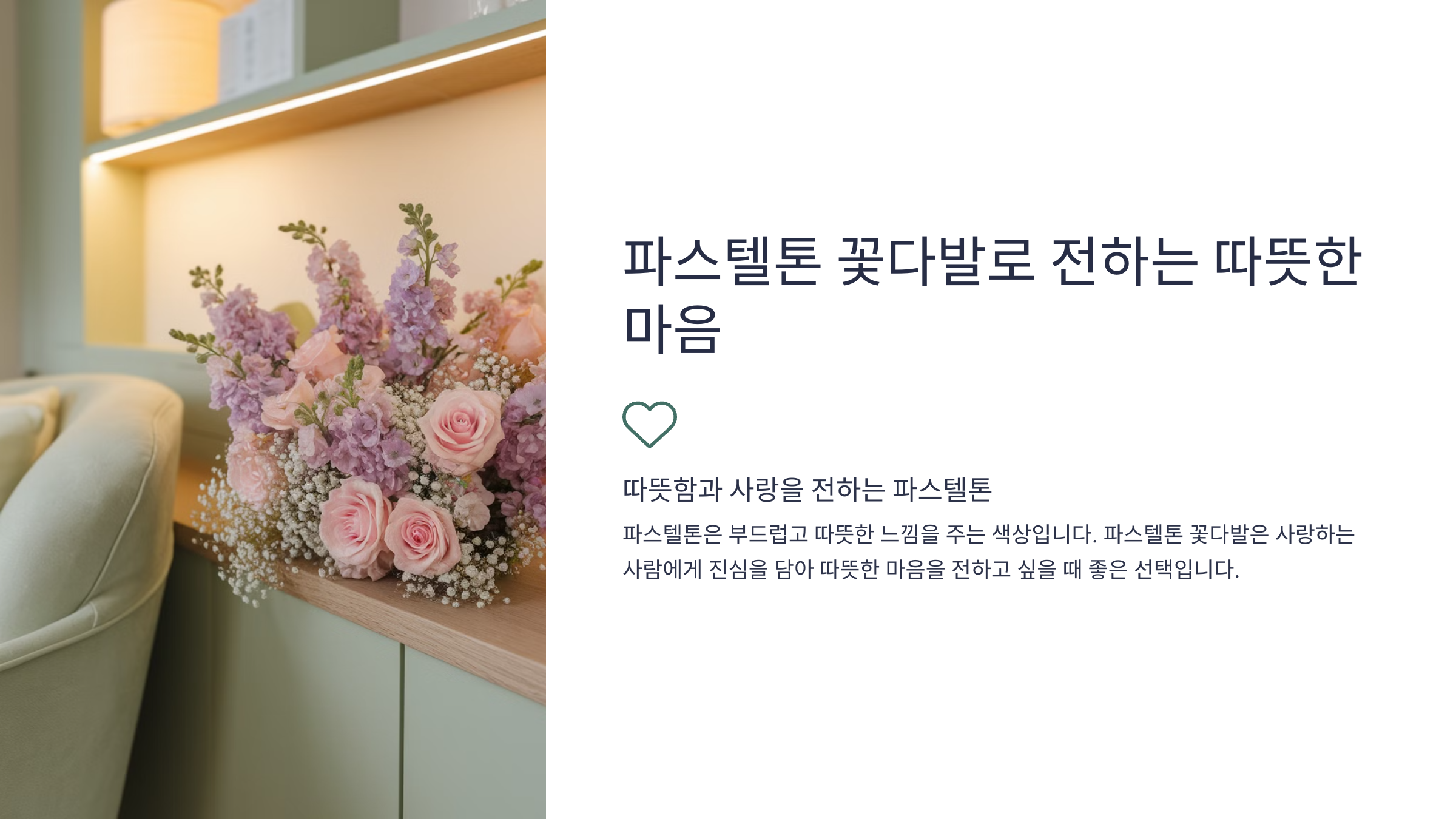 파스텔톤 꽃다발은 부드러운 색감 덕분에 따뜻하고 편안한 분위기를 연출해요. 화려한 원색 꽃보다 은은한 느낌을 주기 때문에 감성적인 선물로 많이 선택되죠. 특히 생일, 기념일, 감사의 마음을 전할 때 좋은 선택이에요. 🎨