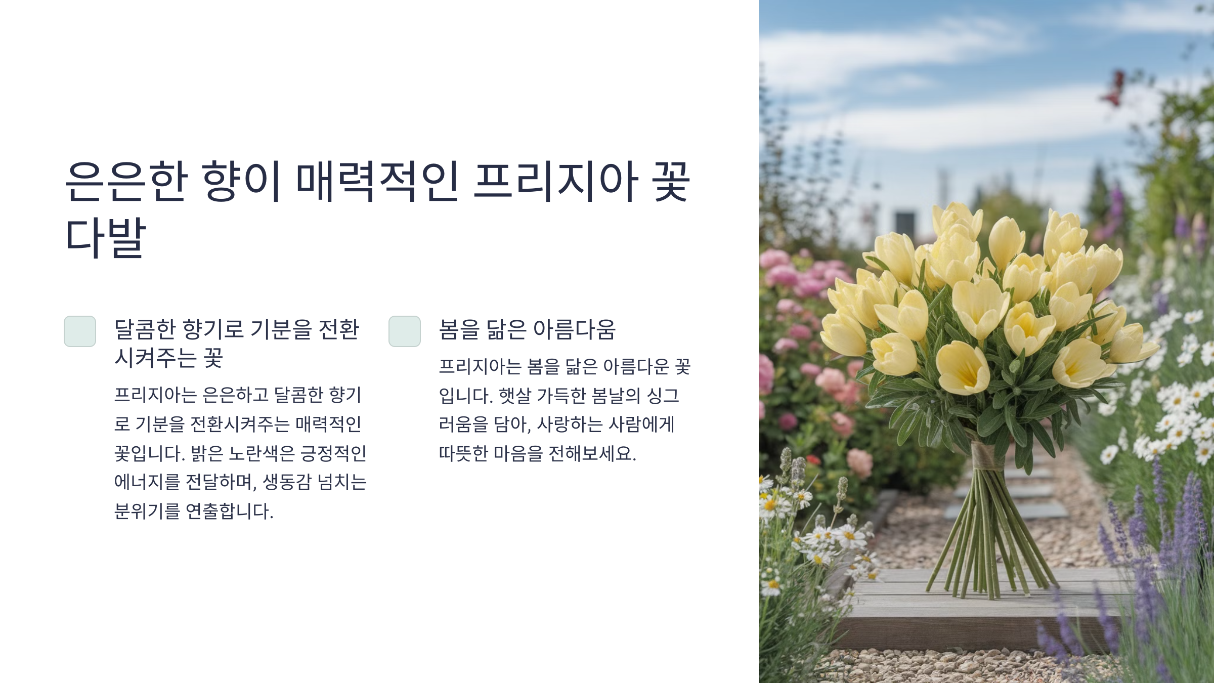 특히 프리지아는 졸업, 새 출발, 축하의 순간에 잘 어울려요. 봄꽃과 함께 조합하면 더욱 산뜻한 느낌을 줄 수 있답니다. 여기에 안개꽃이나 유칼립투스를 곁들이면 자연스럽고 세련된 분위기를 연출할 수 있어요.
