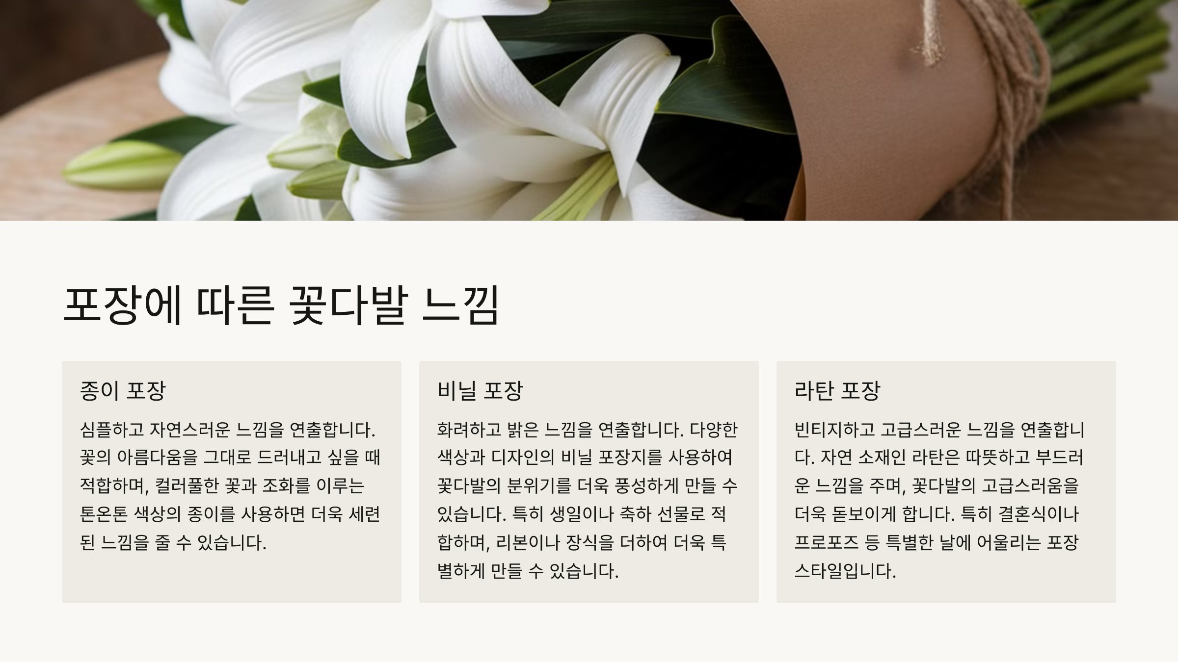 꽃다발의 분위기는 어떤 꽃을 사용하느냐도 중요하지만, 포장 방식에 따라서도 큰 차이가 나요. 포장지는 꽃을 더욱 돋보이게 하고, 전체적인 느낌을 완성하는 중요한 요소랍니다. 🎁