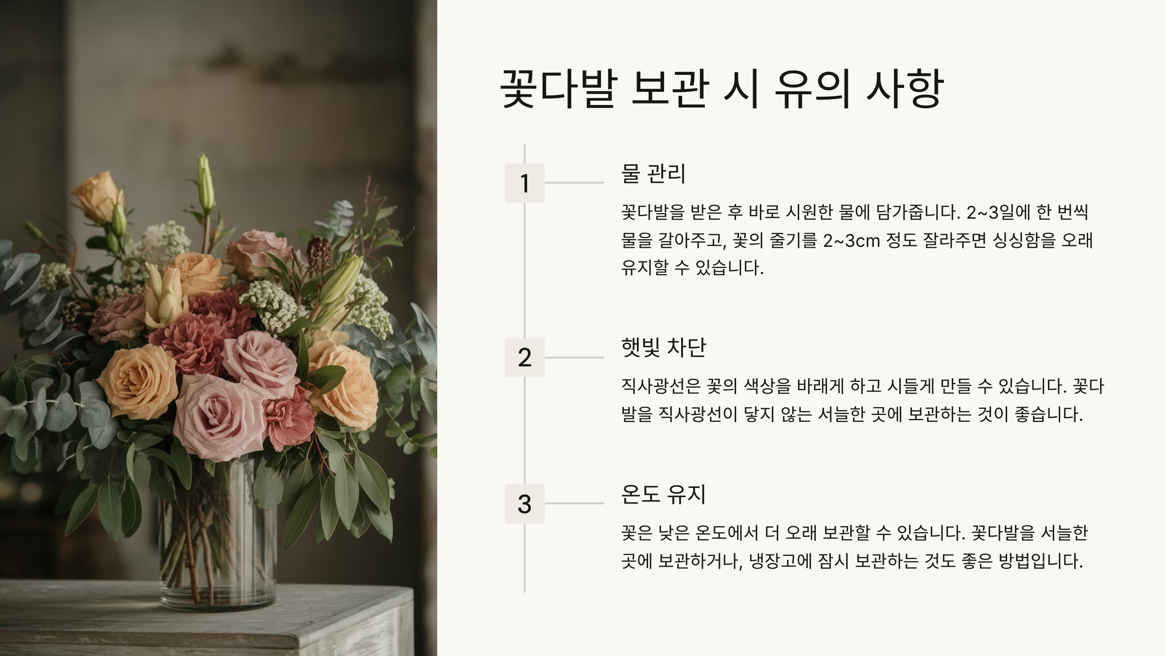 꽃다발을 받았을 때, 신선함을 오래 유지하고 싶다면 올바른 보관 방법이 중요해요. 🌿 꽃은 생명이 있는 식물이기 때문에 잘 관리하면 더 오랫동안 아름다움을 감상할 수 있답니다.